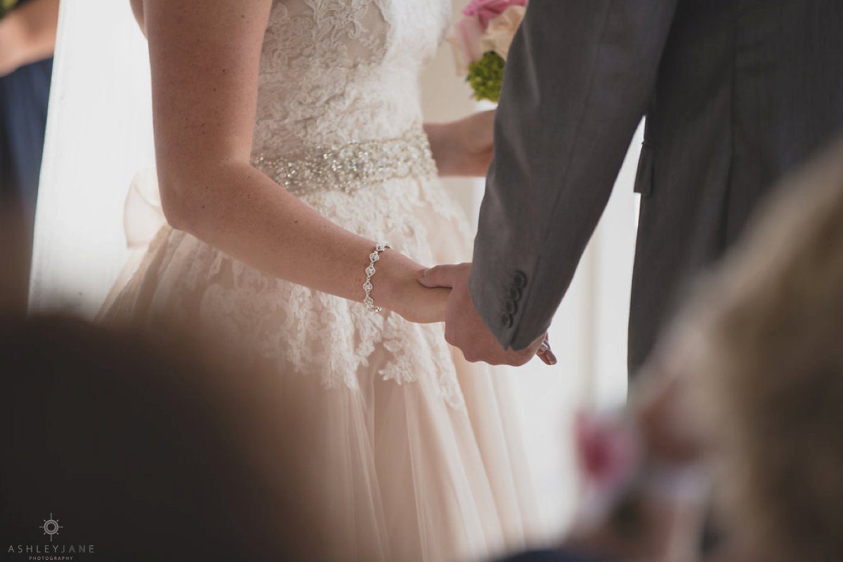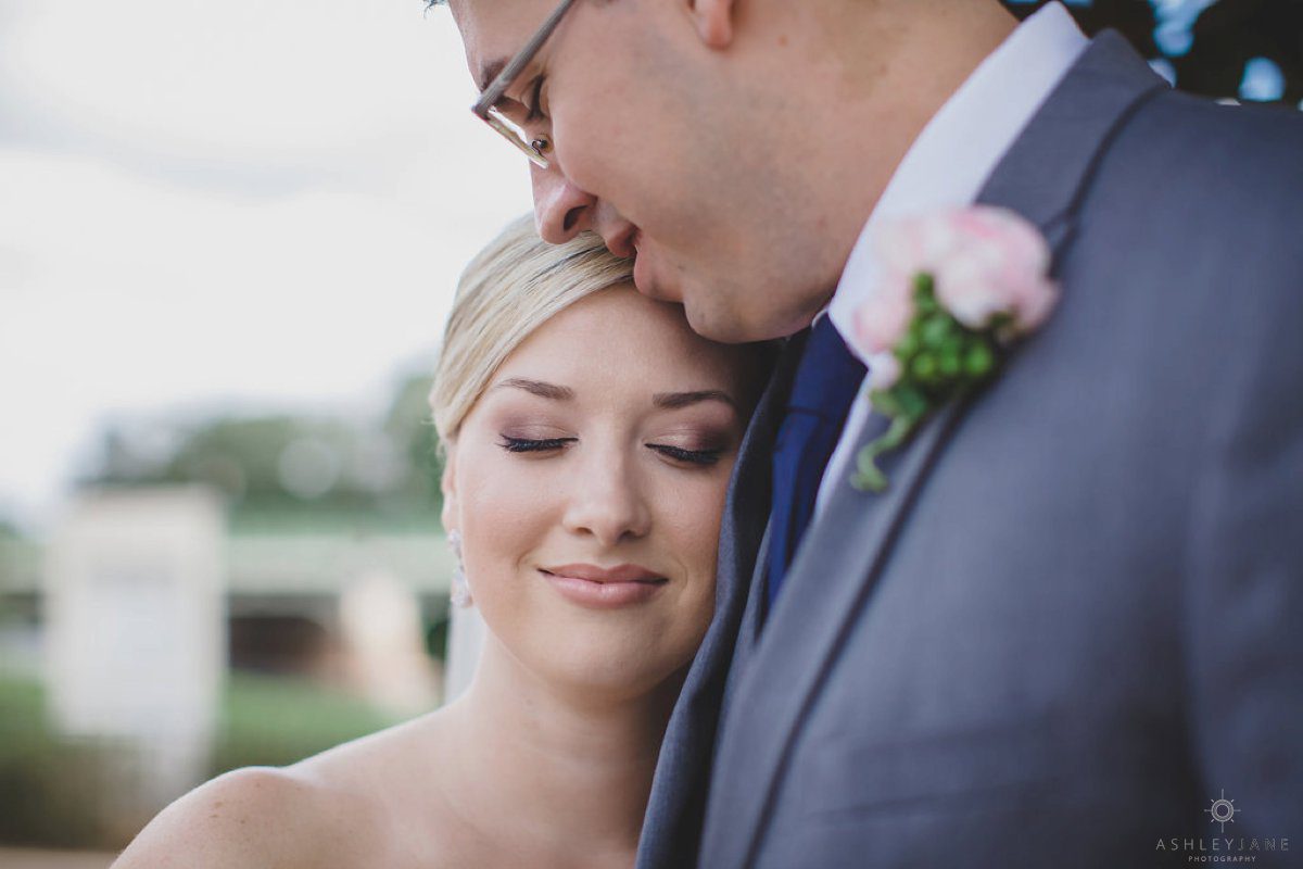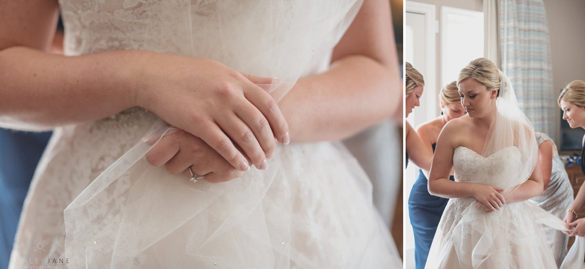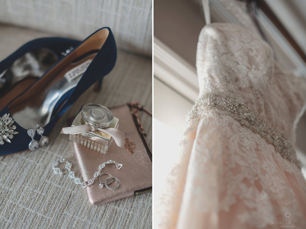 Rachel’s gown was a Mori Lee Lace Ball gown in champagne with alencon lace. Her three bridesmaids wore navy blue floor length dresses. Their bouquets were a collection of white, pink and green floral, which mirrored the floral throughout the ceremony and reception décor. The men wore gray suits.