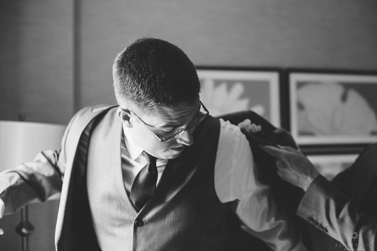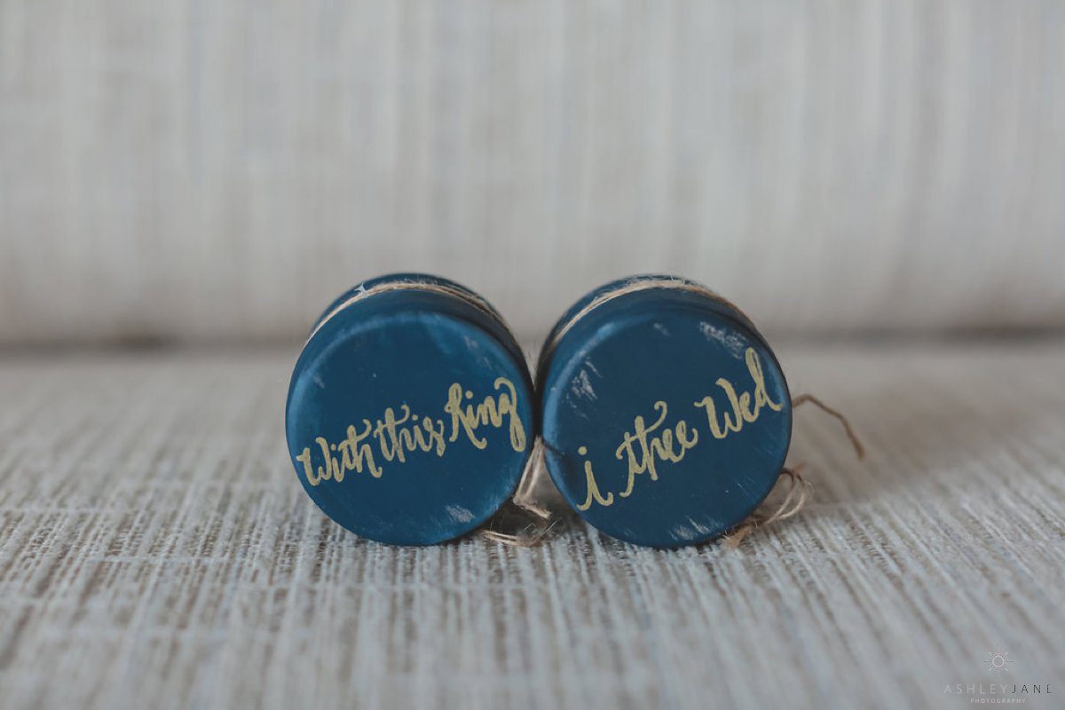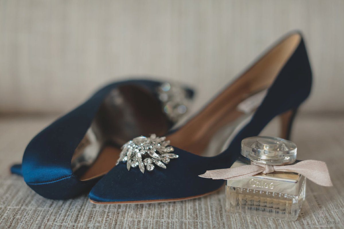 Rachel’s gown was a Mori Lee Lace Ball gown in champagne with alencon lace. Her three bridesmaids wore navy blue floor length dresses. Their bouquets were a collection of white, pink and green floral, which mirrored the floral throughout the ceremony and reception décor. The men wore gray suits.