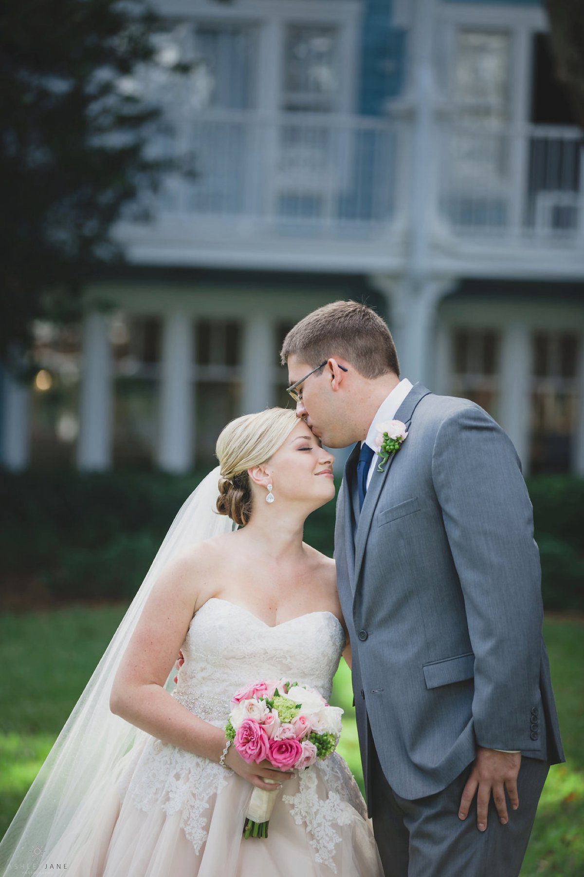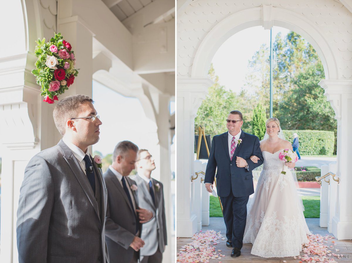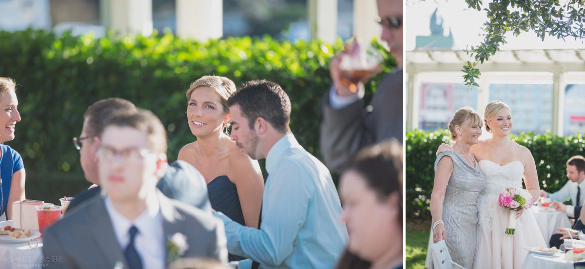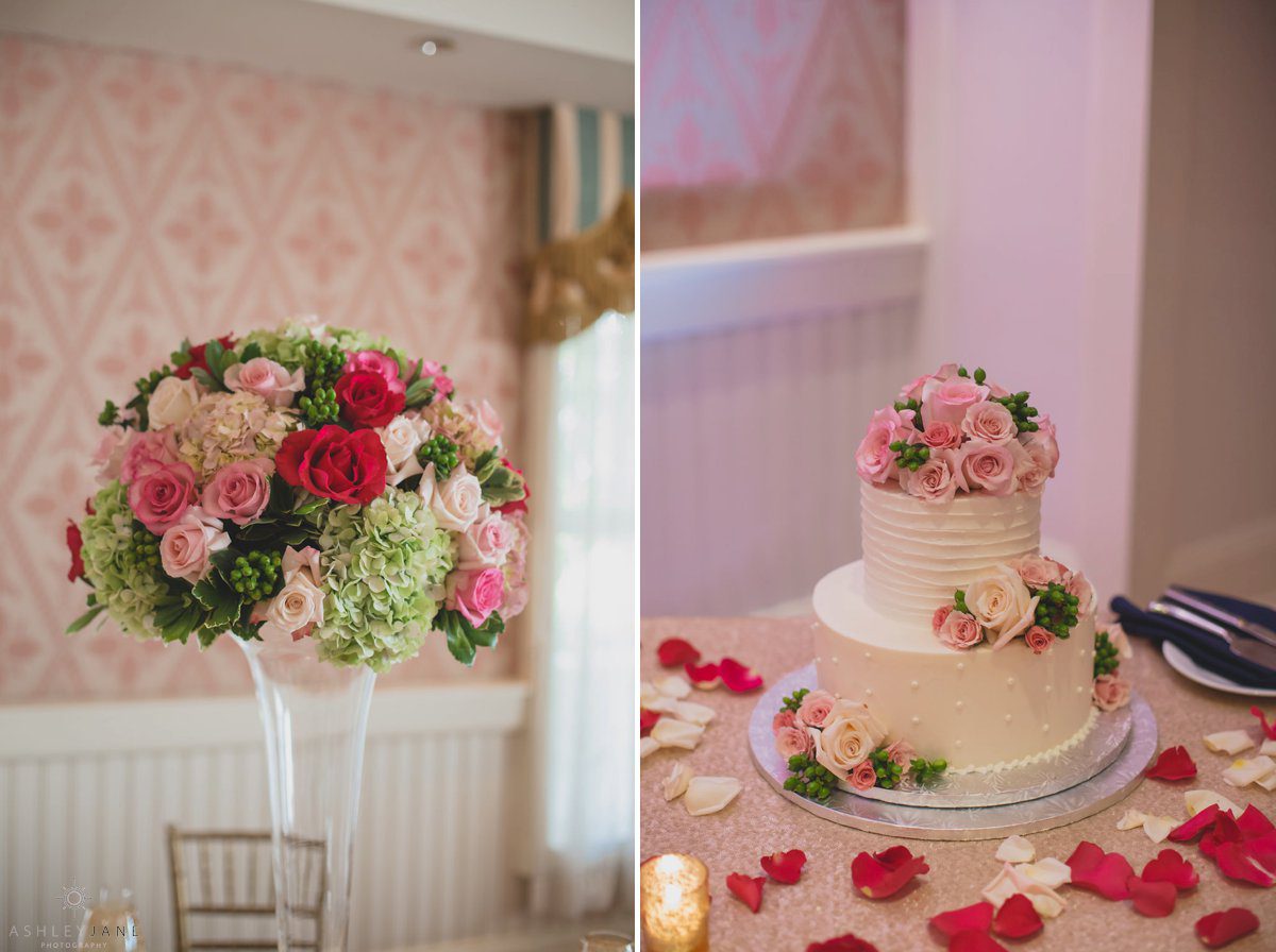 The elegant white gazebo at Sea Breeze Point was made into the perfect romantic spot with three floral arrangements framing their alter and pink petals lining the aisle. After the ceremony the guests were invited to a cocktail hour on the lawn next to Sea Breeze Point. There they enjoyed the music from a string player and a cheese table.