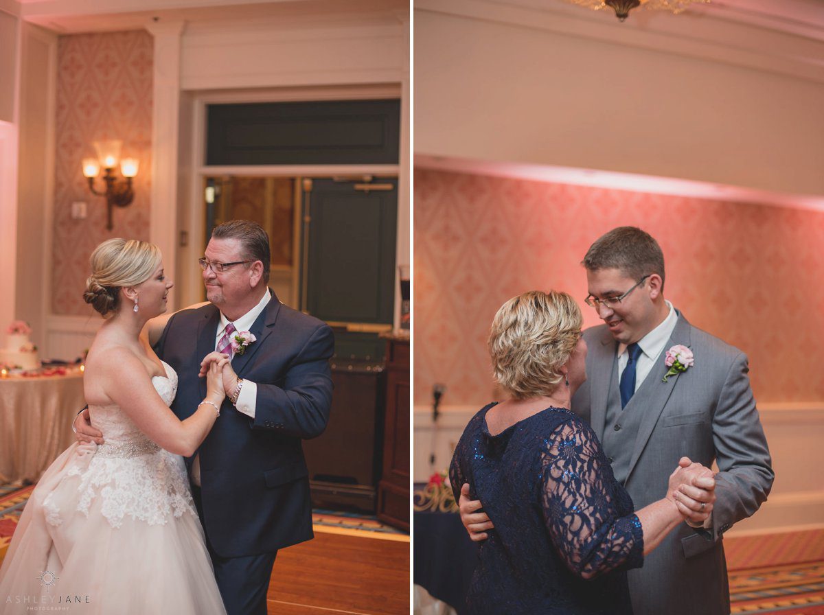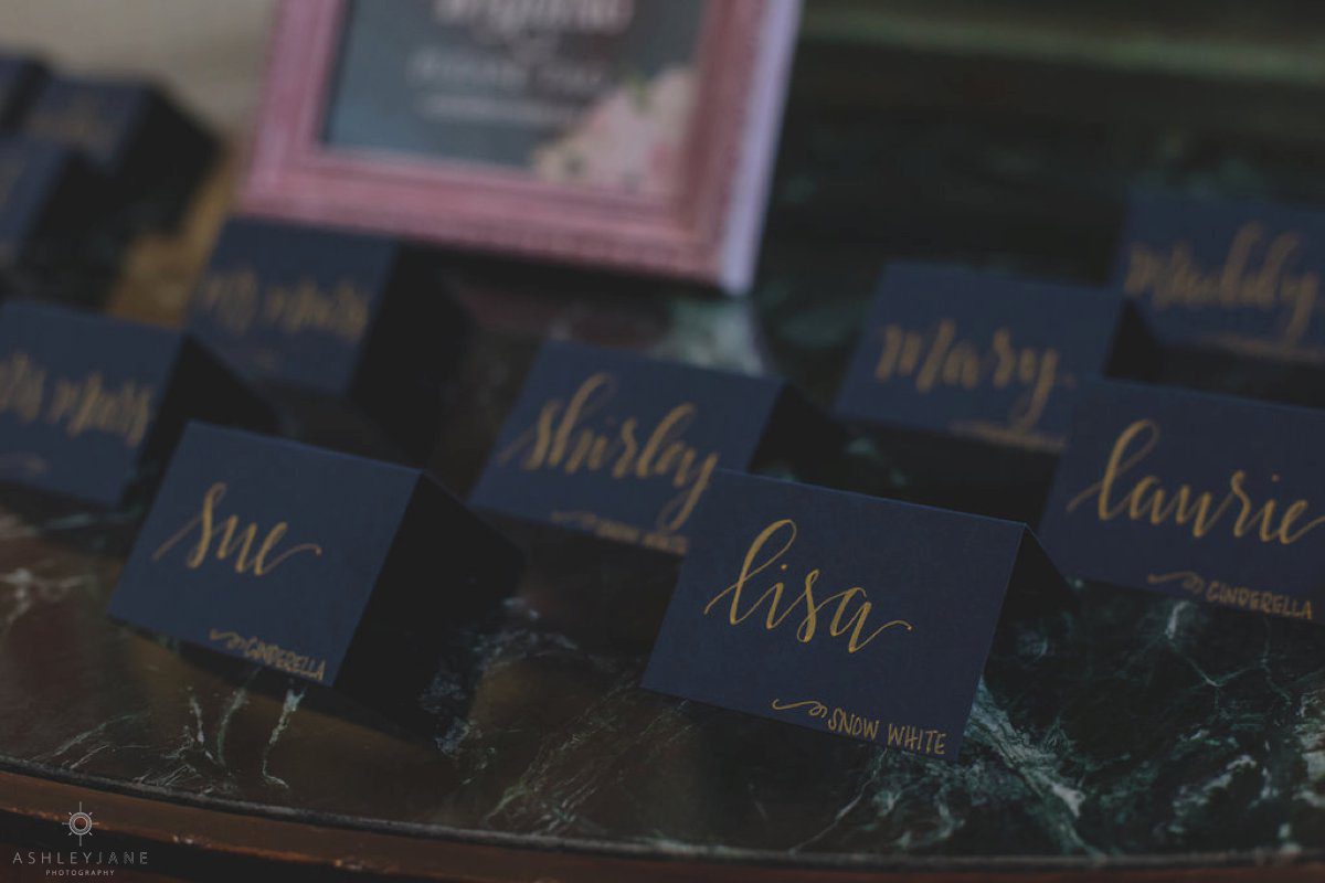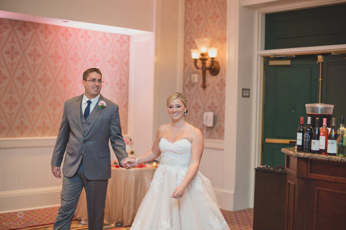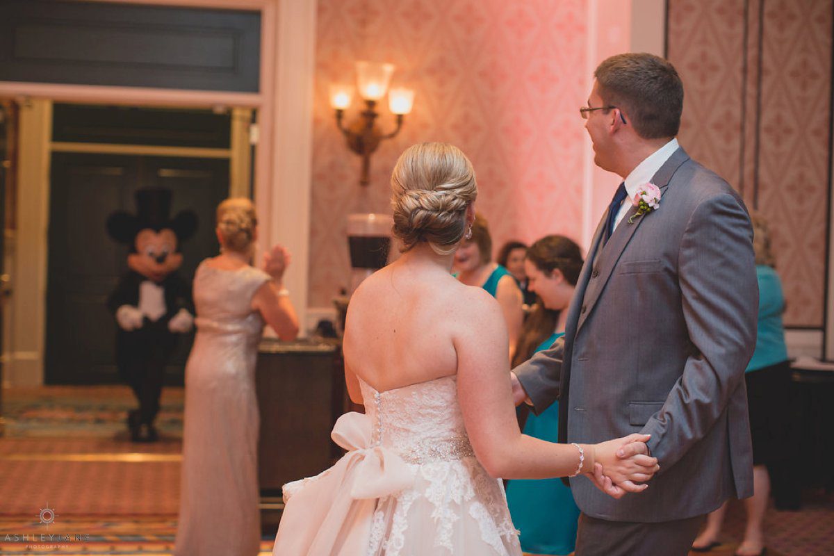 Rachel and Corey’s reception was held at the St. James Place at the Boardwalk Convention Center. The room was beautifully arranged in gold and pink. Each table was marked by a poster from vintage Disney love stories.
