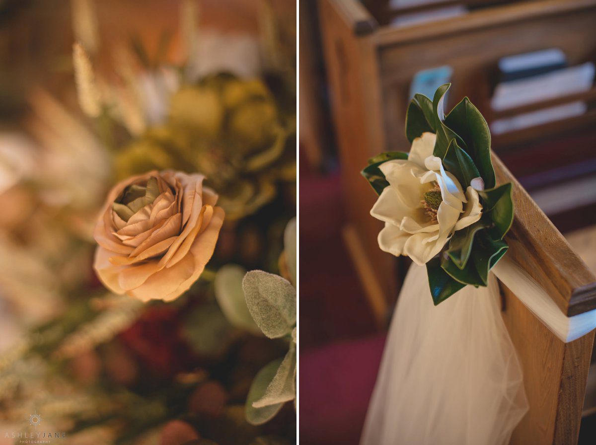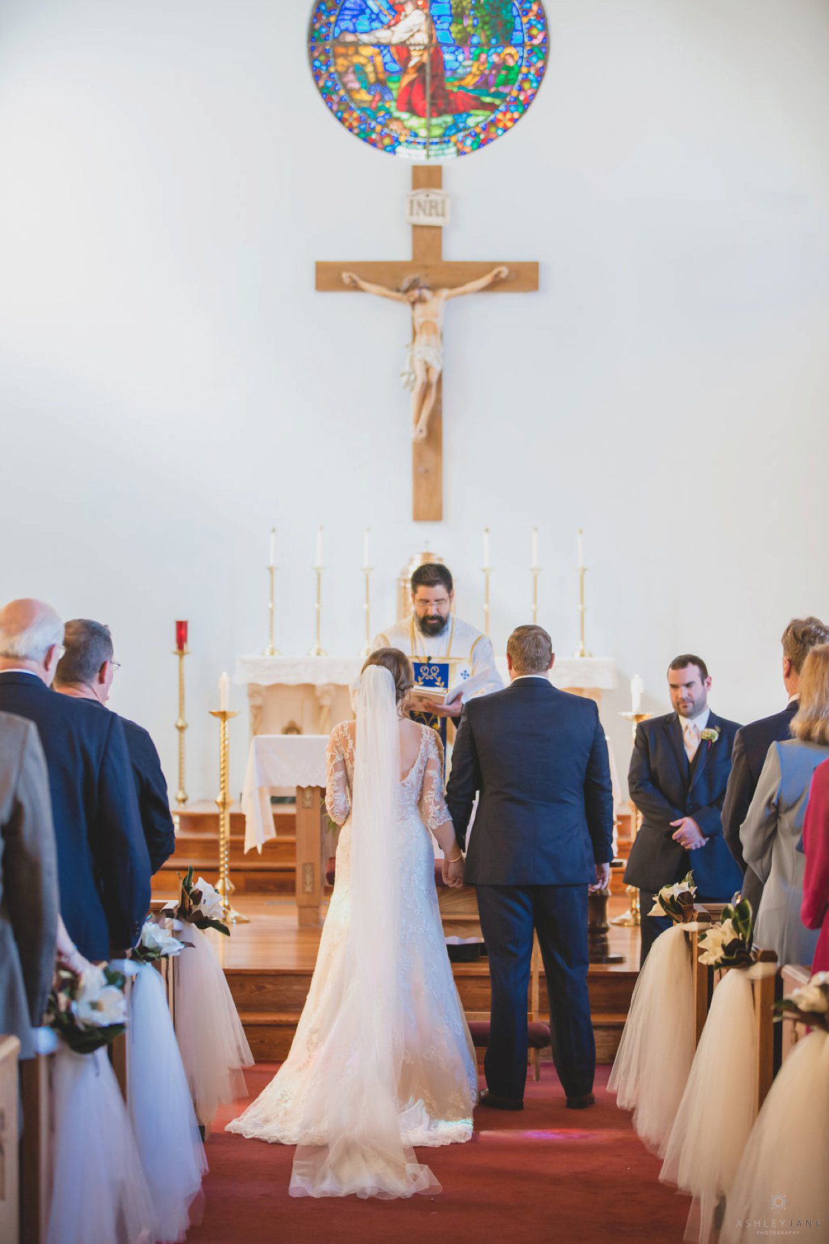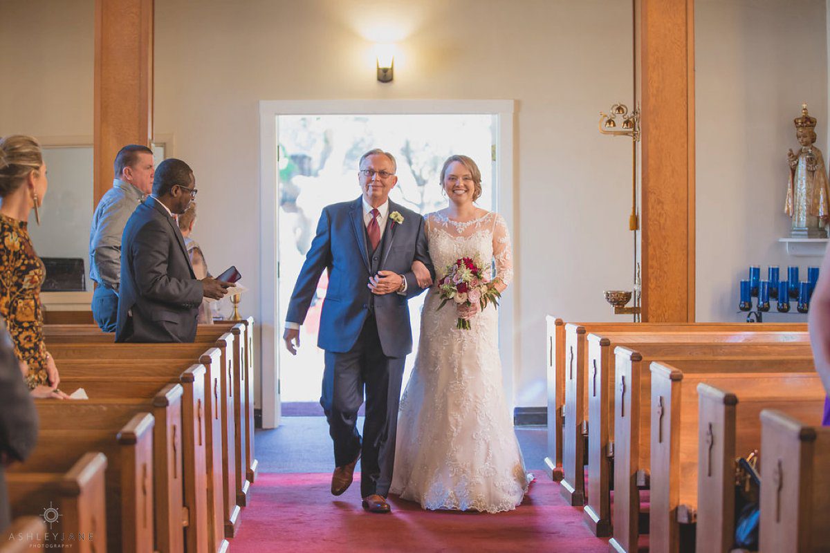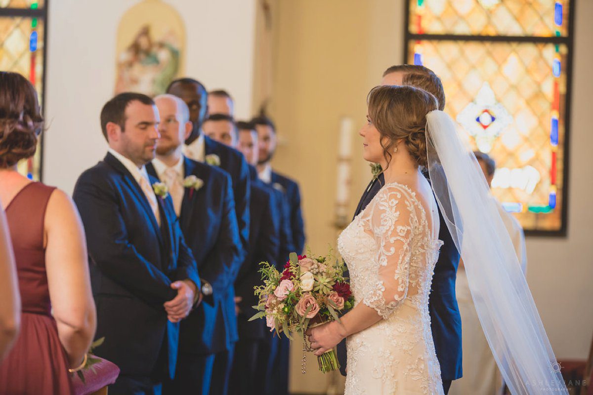 Ty and Allison had a very traditional church ceremony at All Souls Historic Chapel. The historic chapel was beautiful with high ceilings, allowing for a second level balcony, and tall stand glass windows. The aisle was lined with tulle and magnolias.