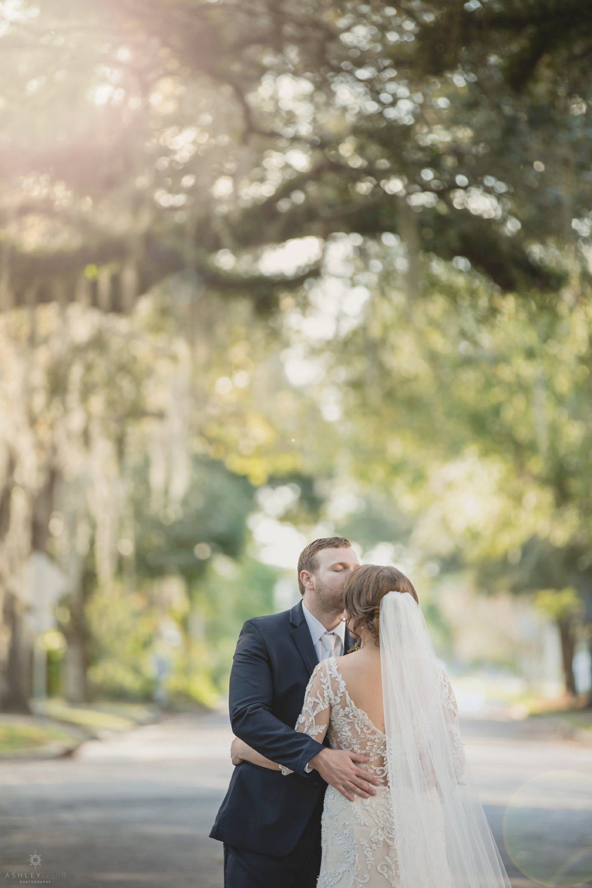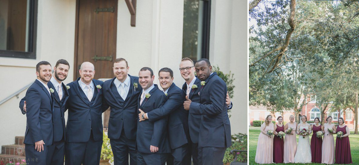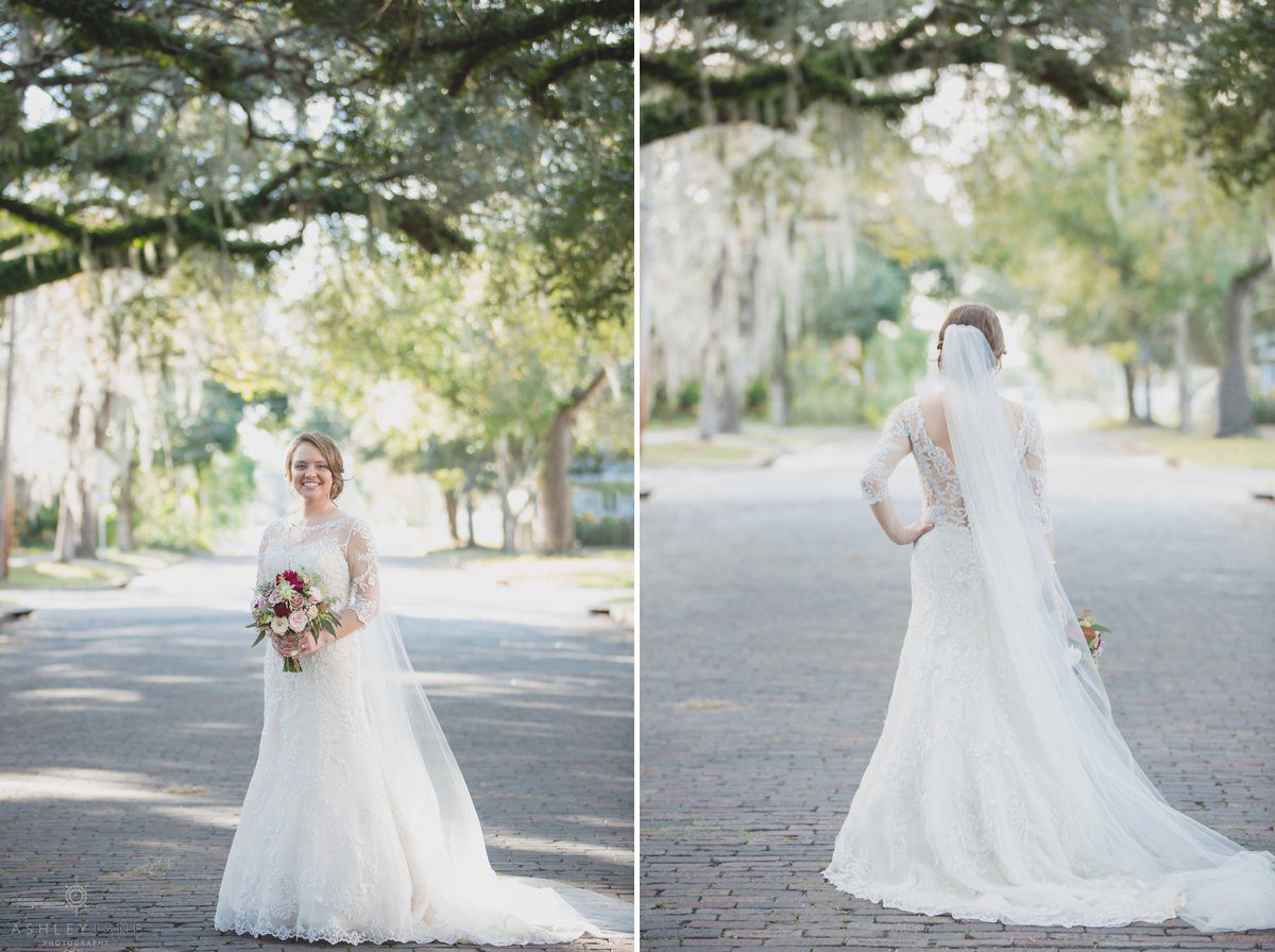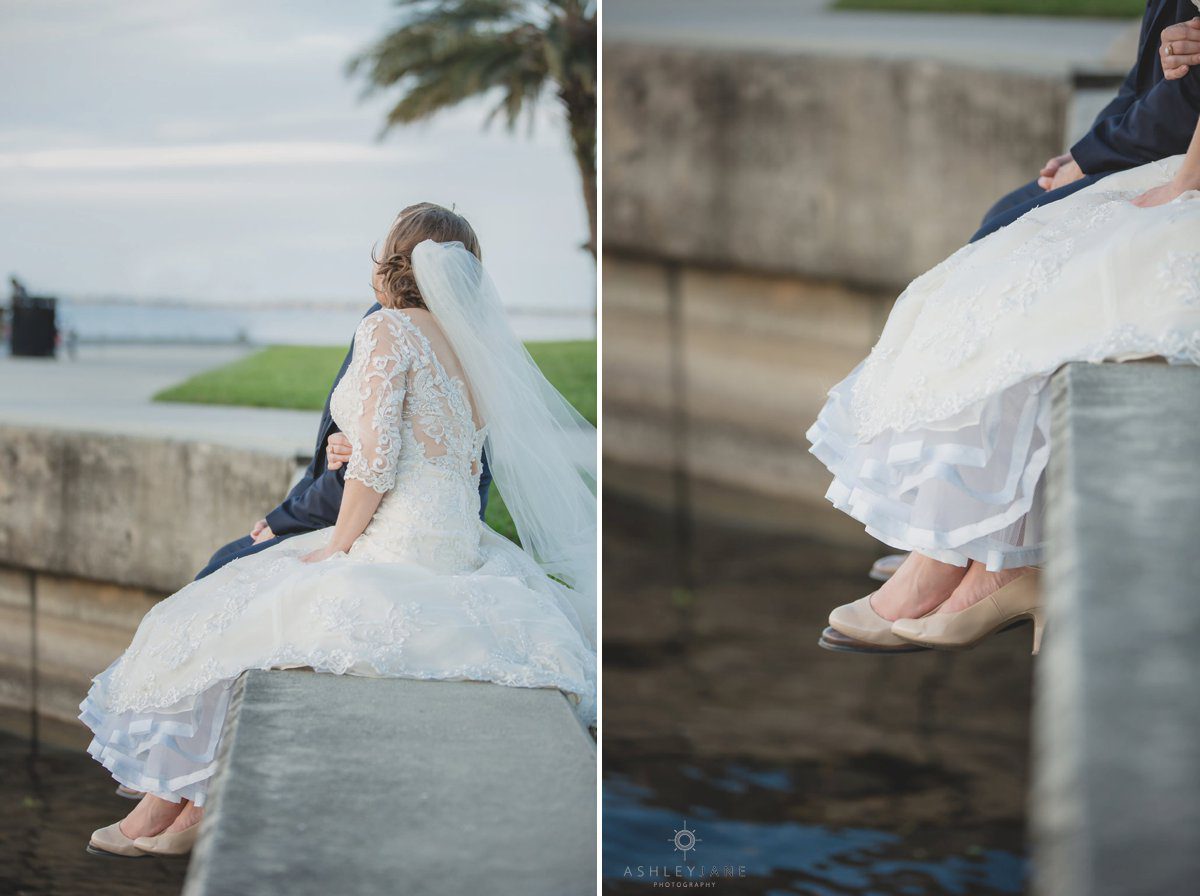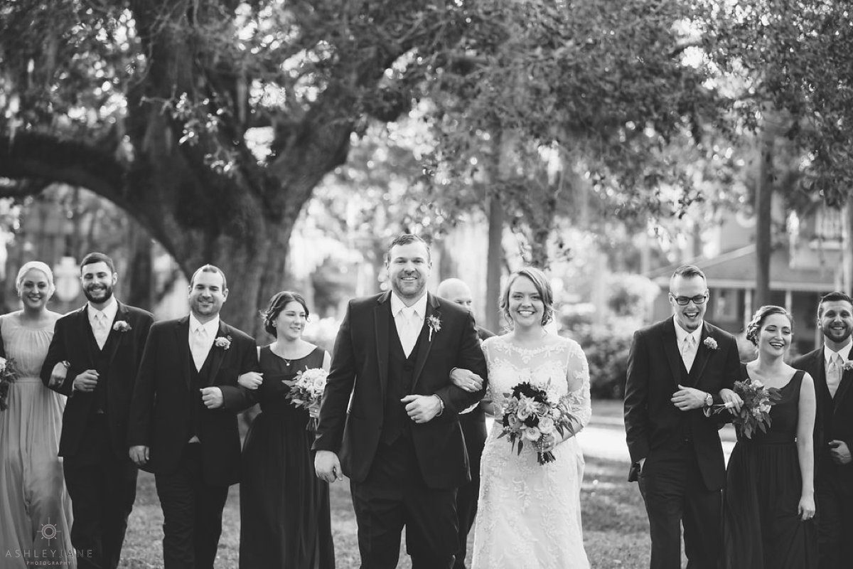 We then moved outside for just married portraits and bridal party images. Underneath the large Florida tree canopy, where we were able to capture some awesome portraits with Allison’s veil over her and Ty’s heads with the warm sun shining around them. Allison said that she and Ty love to be outside, especially near the water. With lake Monroe so close by we went by the water for sunset portraits.