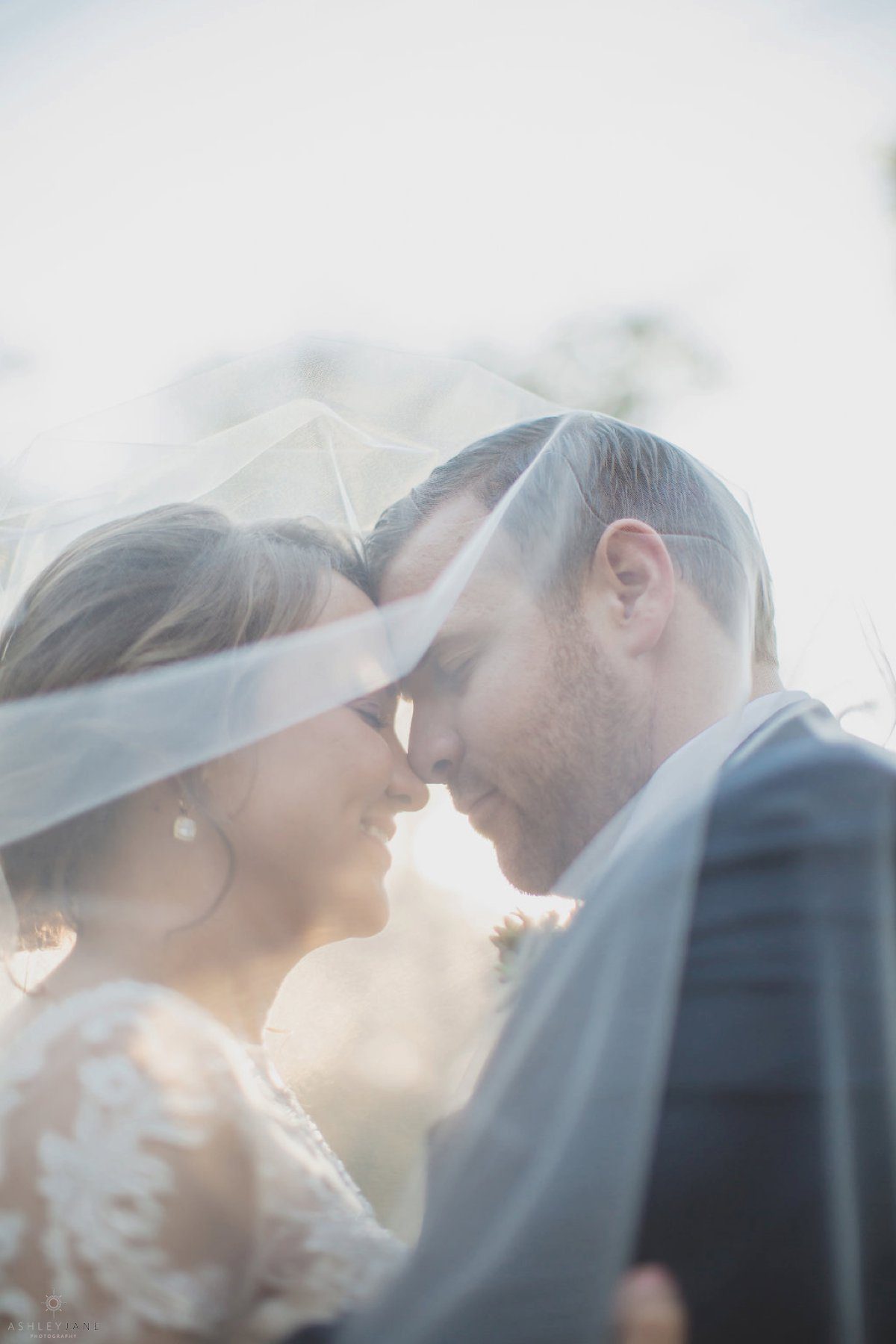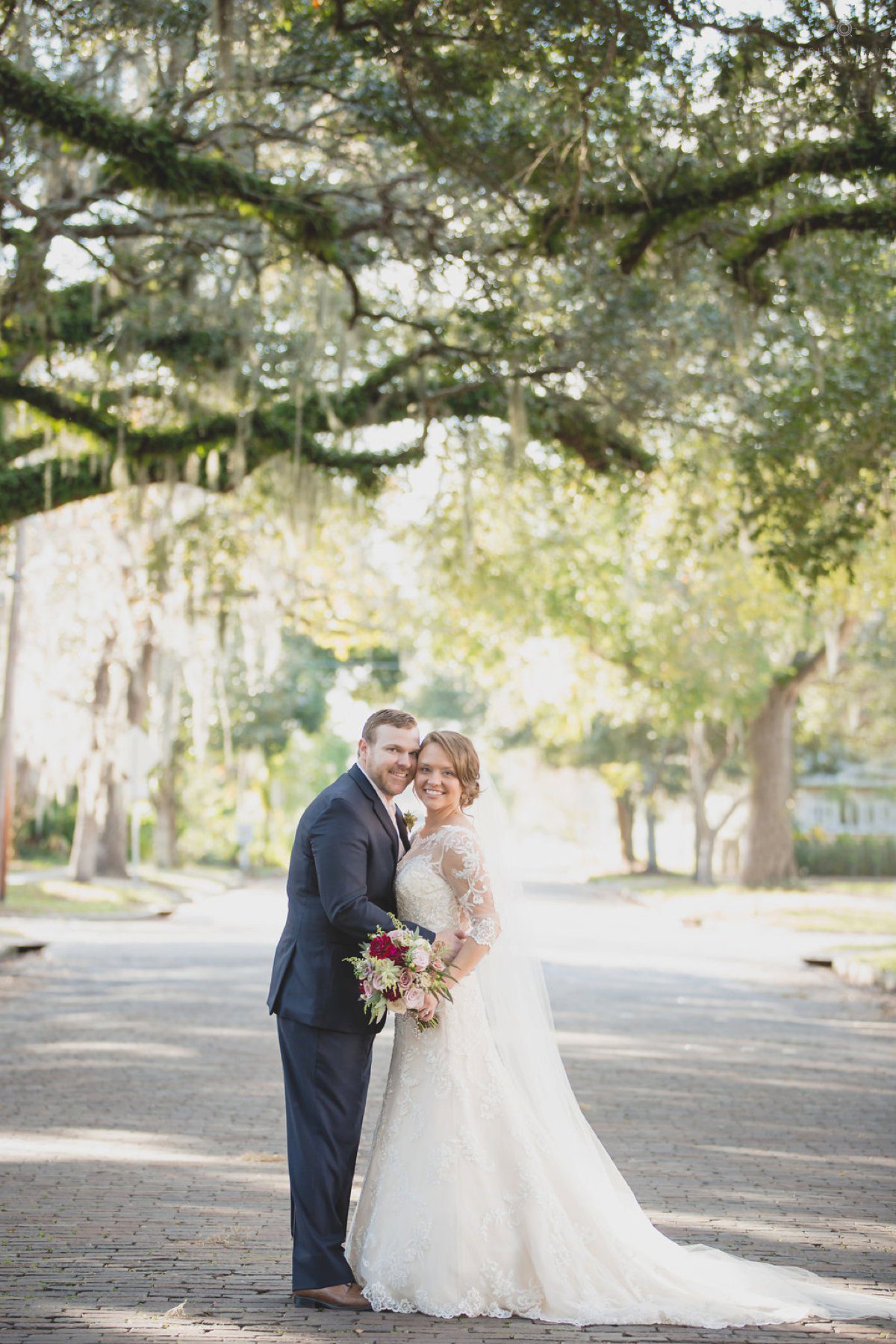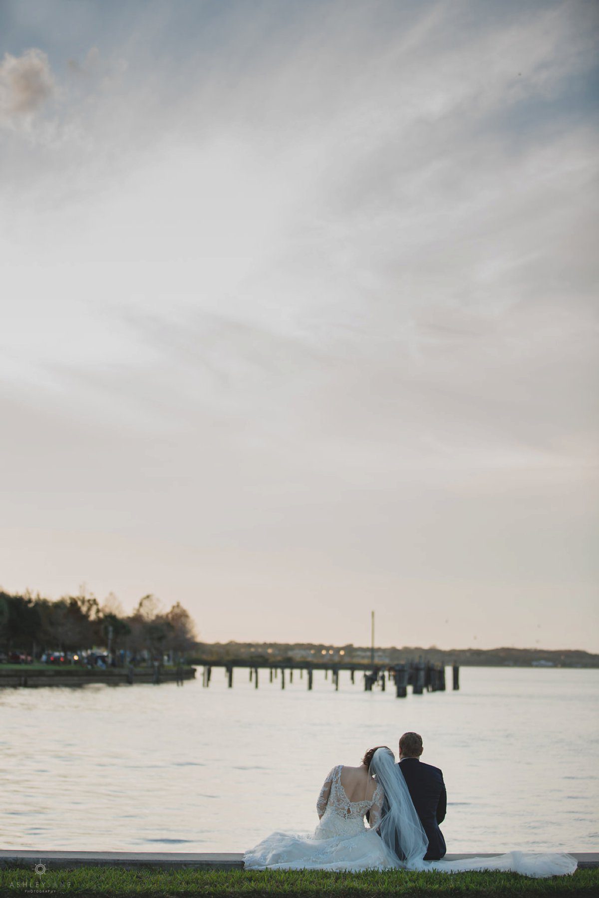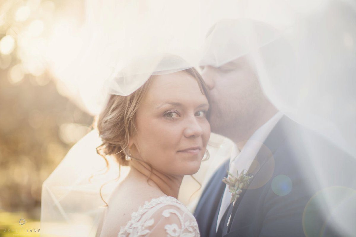 We then moved outside for just married portraits and bridal party images. Underneath the large Florida tree canopy, where we were able to capture some awesome portraits with Allison’s veil over her and Ty’s heads with the warm sun shining around them. Allison said that she and Ty love to be outside, especially near the water. With lake Monroe so close by we went by the water for sunset portraits.