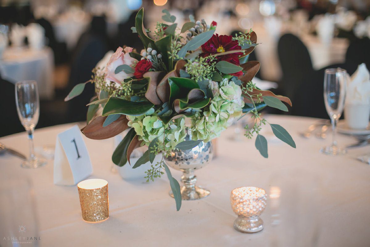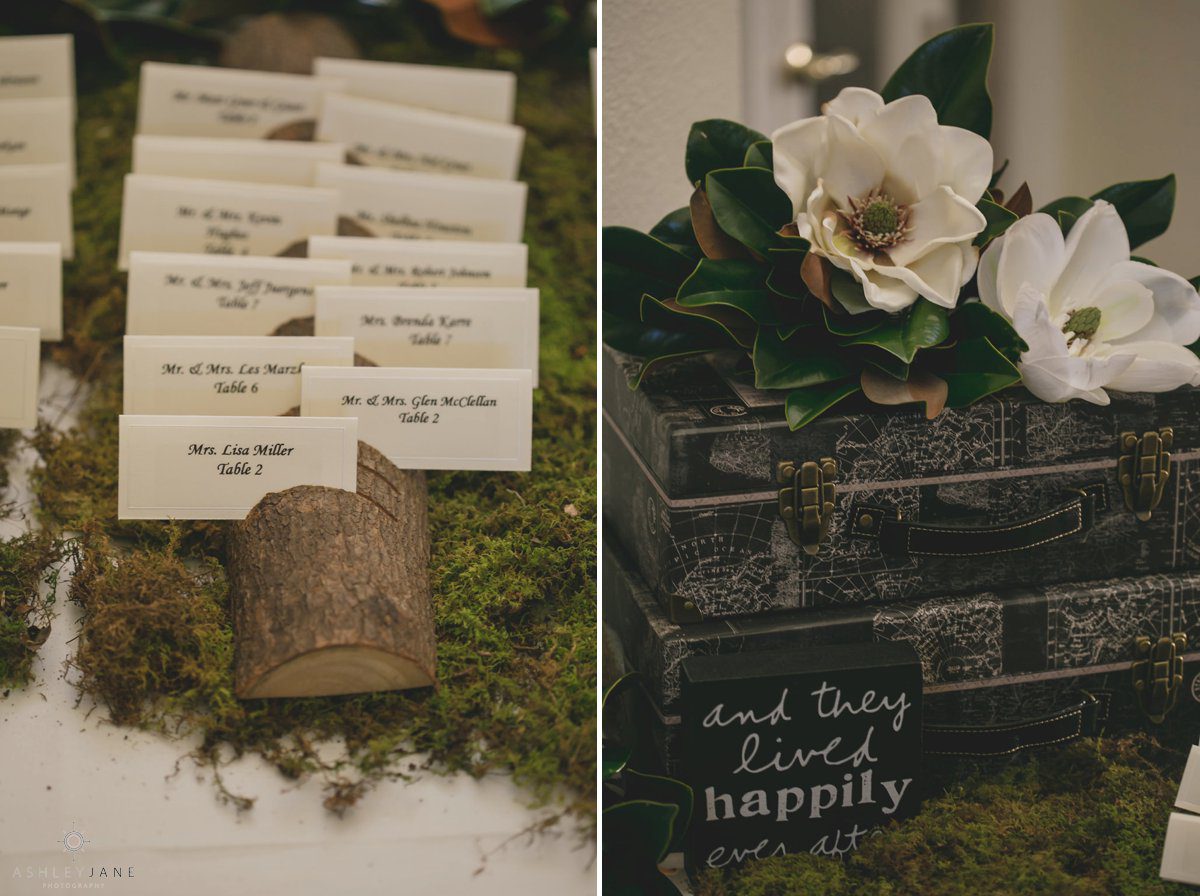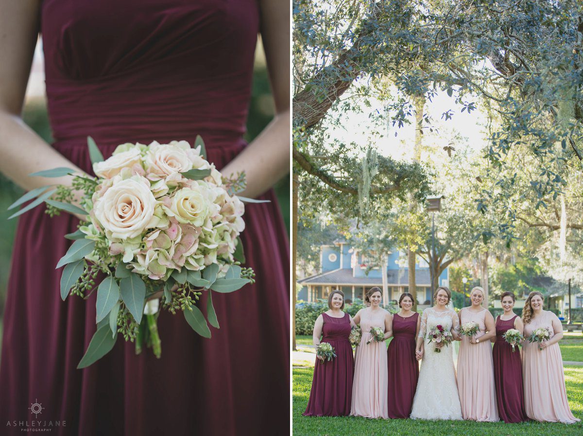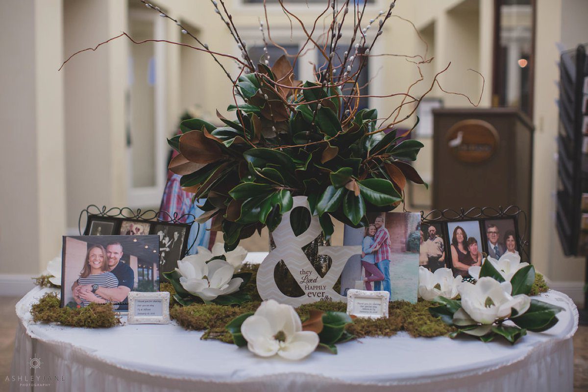 Allison and Ty’s reception was held at the Debary Golf and Country Club. Their color scheme of blush, merlot and navy married perfectly with the venue. Their décor included vintage pieces, candles and natural elements. The incorporation of magnolias was continued throughout the reception floral arrangements.