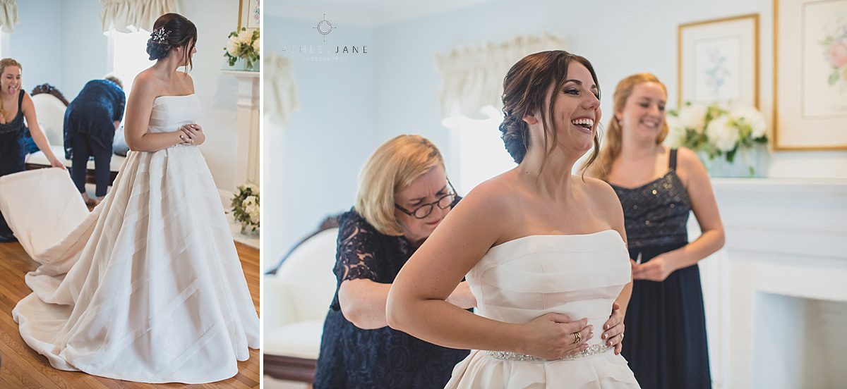 The Bride looked absolutely stunning and effortless in her satin strapless wedding gown. She opted for a whimsy up-do and delicate drop earrings for something sparkly. Her something blue was incorporated in her bridesmaids, flower girl, and her groom’s tie.