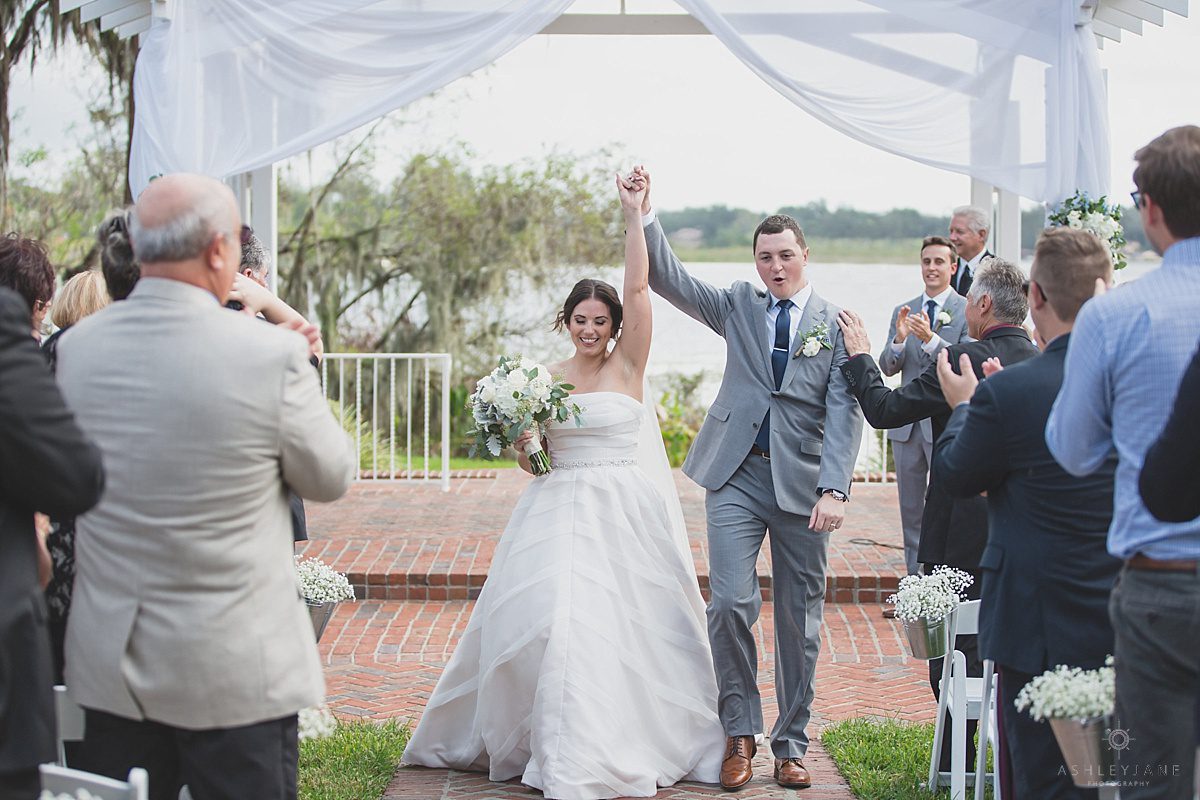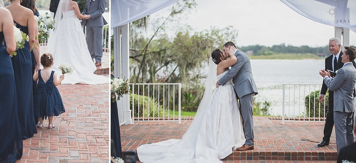Liesl + Richie’s outdoor ceremony was held in the rear of the Cypress Grove Estate House located in Orlando, FL. They got married under the white altar at the estate adorned with dreamy florals. Liesl really wanted to incorporate significance in any detail possible on their big day. The White King Protea flower is native to Liesl’s South African origin – which made the florals all the more special! Along the aisle were galvanized bucket with delicate baby’s breath.