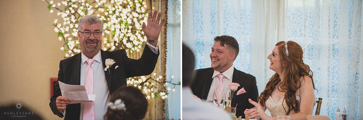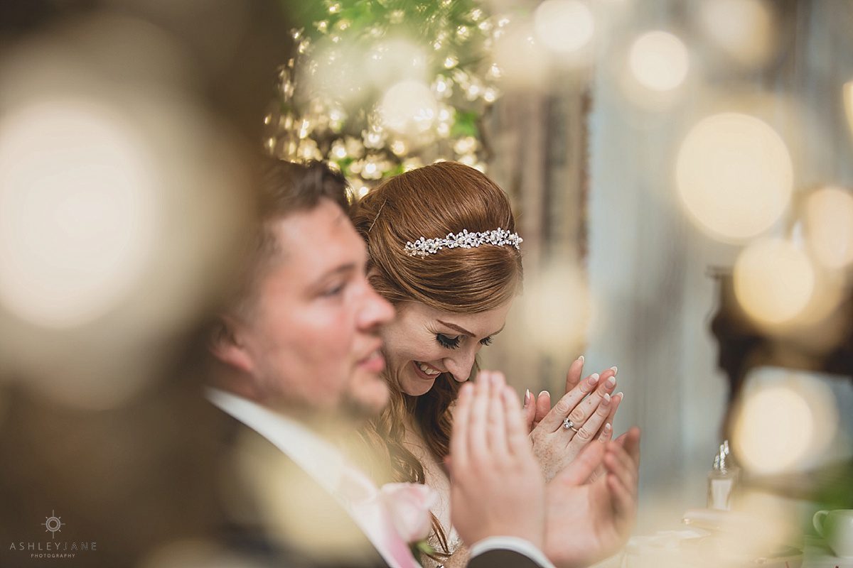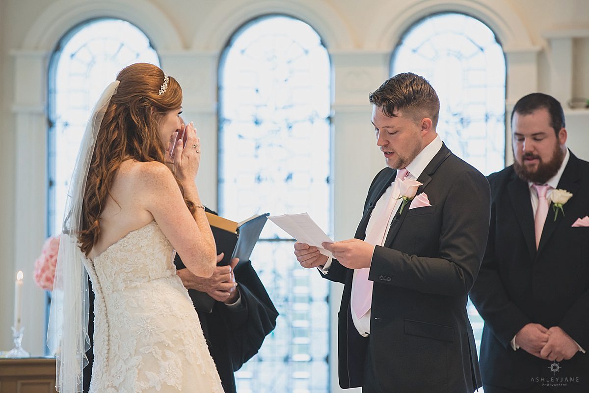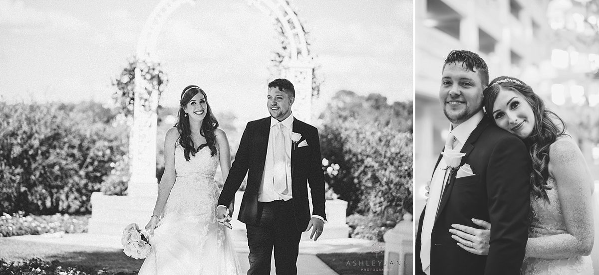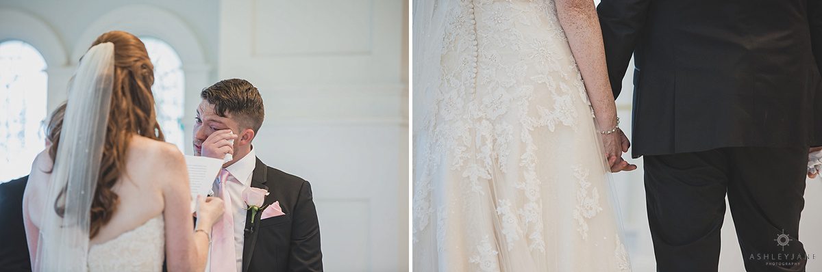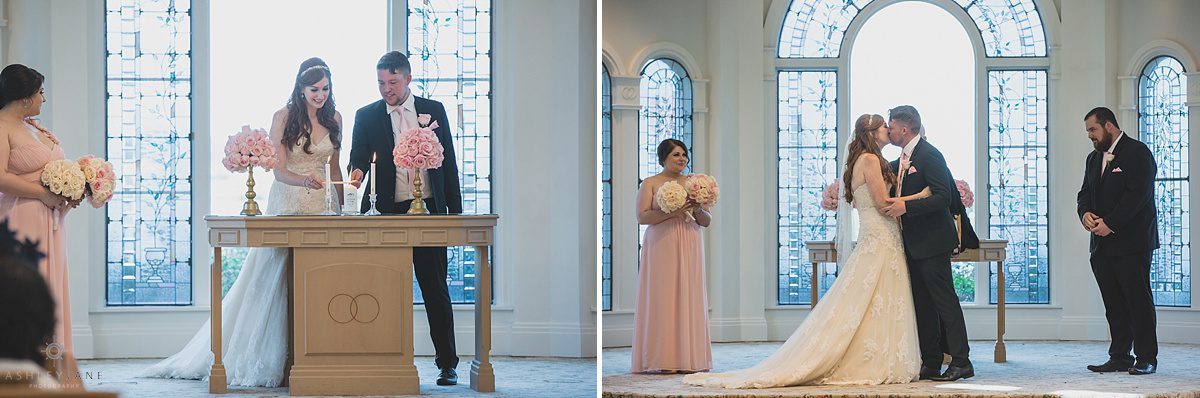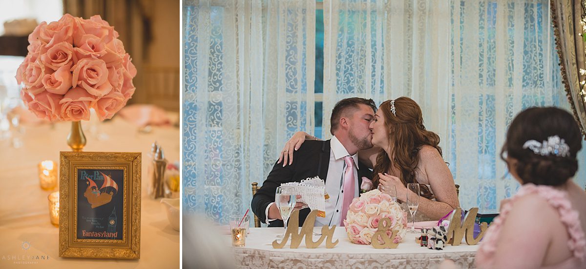 Libby and Ben decide on a “retro” Disney theme. They choose blush pink and gold to create a romantic and dreamy feel. Libby wears a light champagne colored Justin Alexander a-line gown. It’s beaded with lace appliques over a sequined lining. Her shoes have a kissing Mickey & Minnie on the sole.