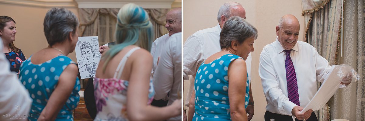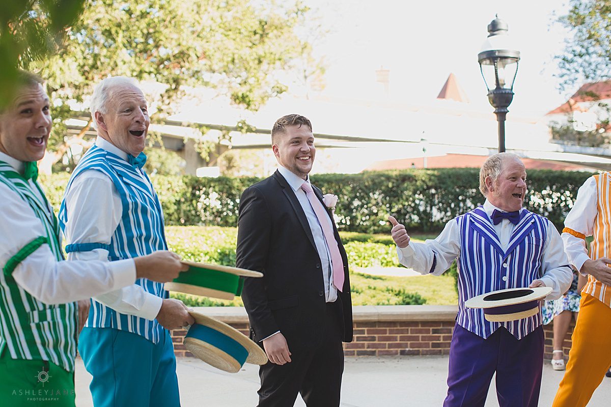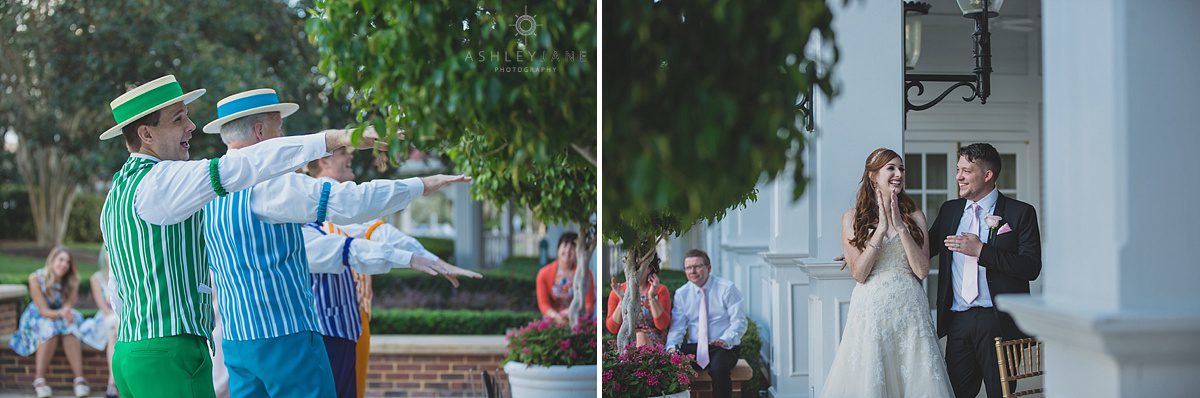 After the ceremony, we head to Whitehall Room & Patio for the reception. The decor is very vintage Disney. Their family and friends sit at tables named after a different Walt Disney World attraction, such as Libby’s favorite ride, The Carousel of Progress. There’s also a Peter Pan and Haunted Mansion table. The barbershop quartet, the Dapper Dans, known for their show on Main Street, USA, sing favorite tunes. And a caricature artist comes to draw a portrait each guest. After some dancing, everyone heads outside for a dessert party at Sago Cay Pointe.