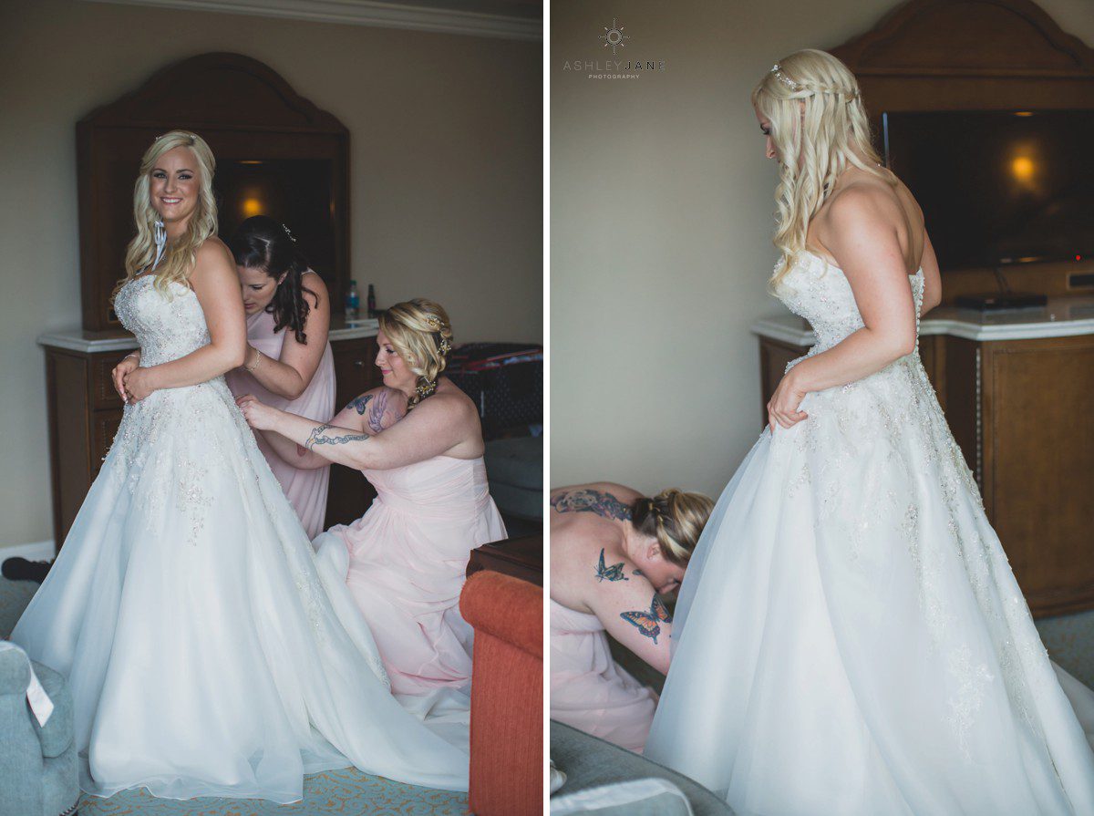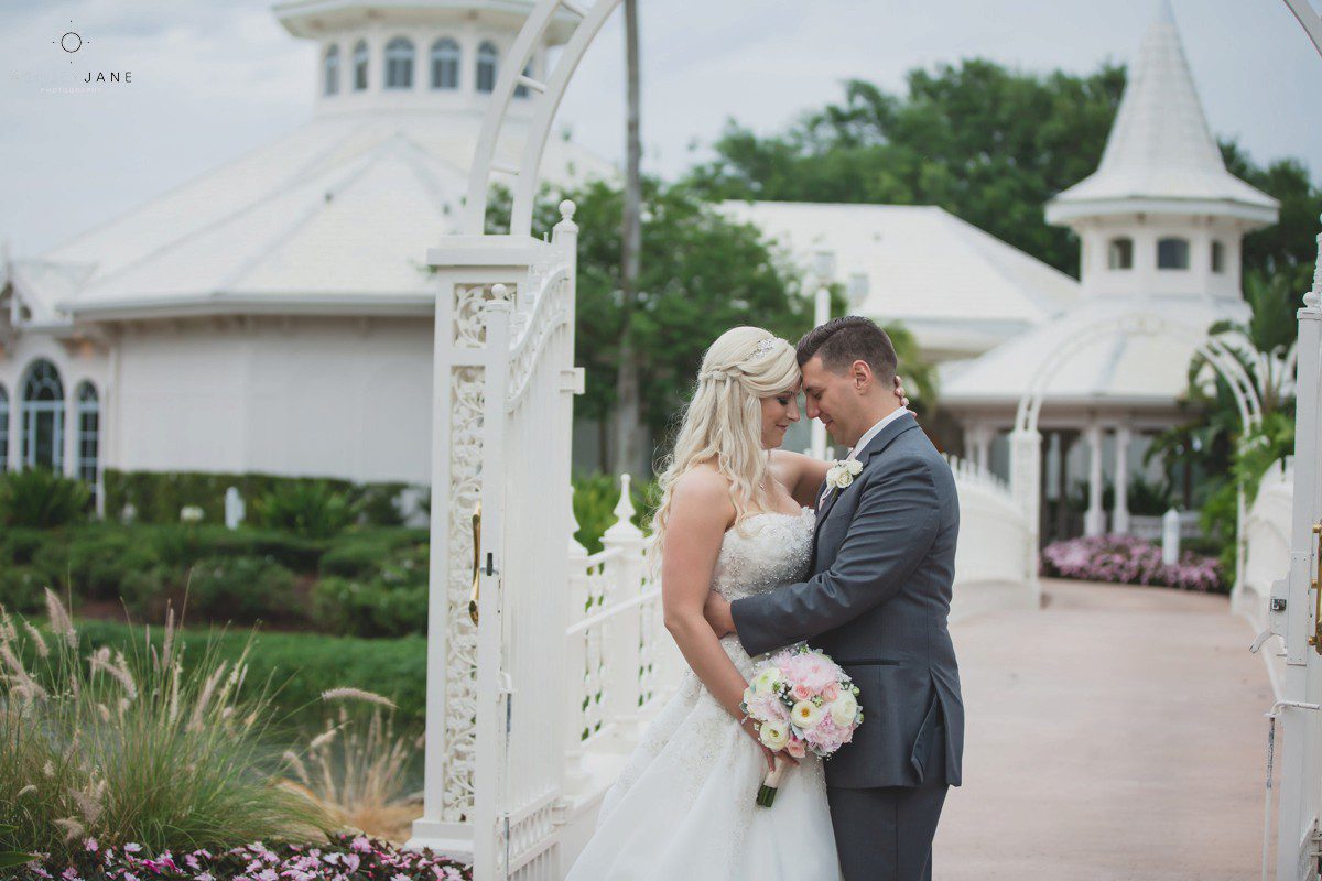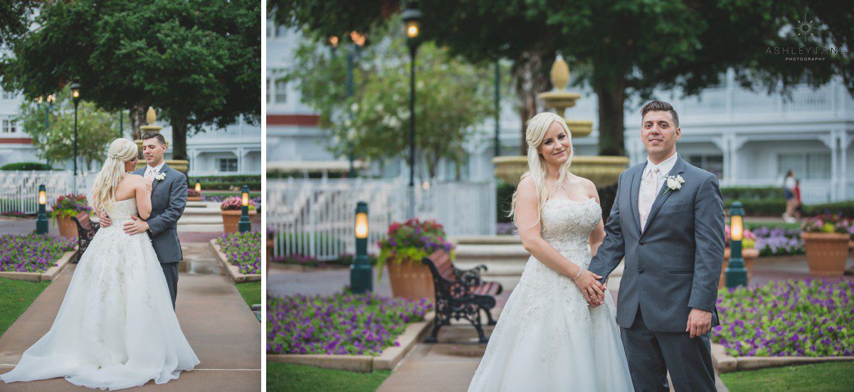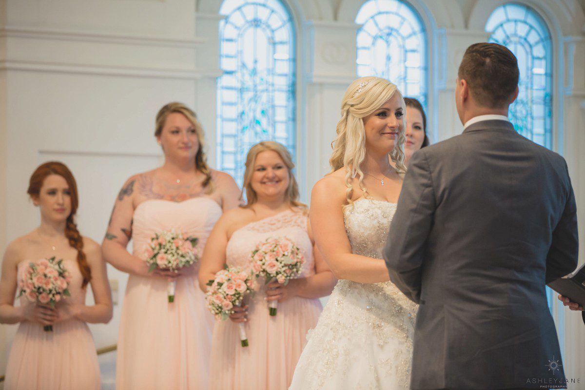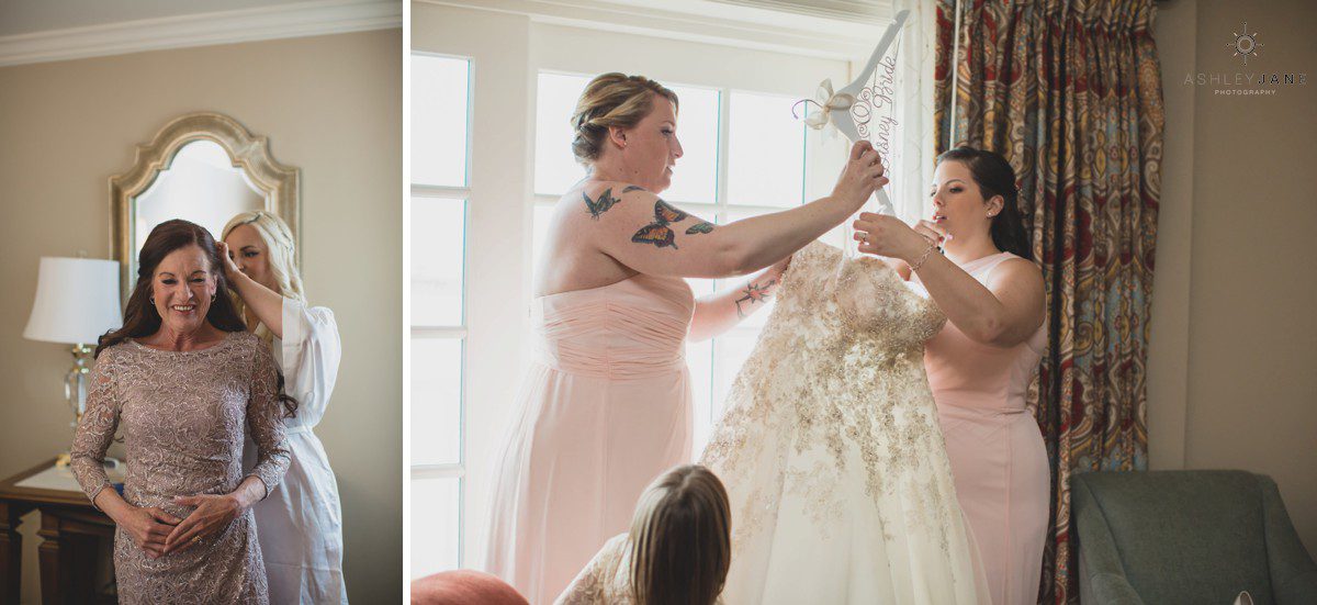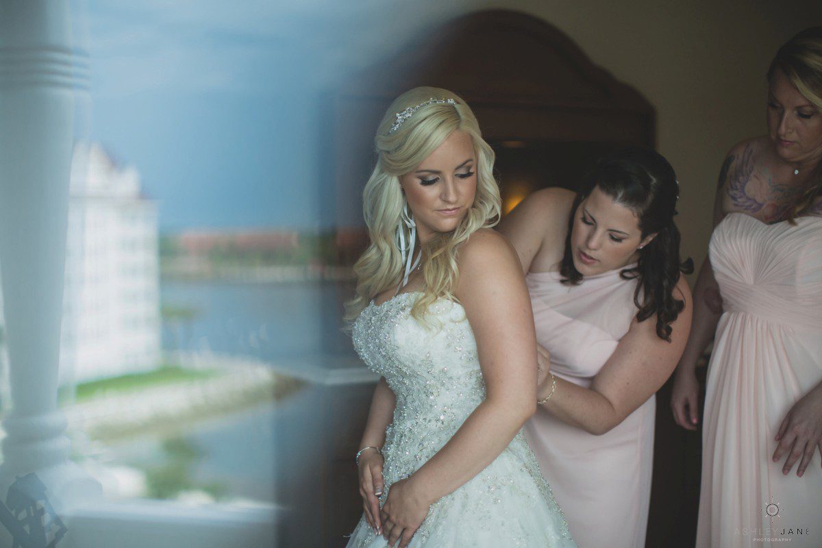Elizabeth gets ready for her big day at Disney’s Grand Floridian Resort. She is wearing a Justin Alexander, ivory and silver A-line ball gown from The Bridal Collection. It has lots of crystals and beading in what she calls “beautiful chaos”. Her four attendants are in various styles of blush pink, chiffon gowns. Each carries beautiful bouquets of pink roses and baby’s-breath.