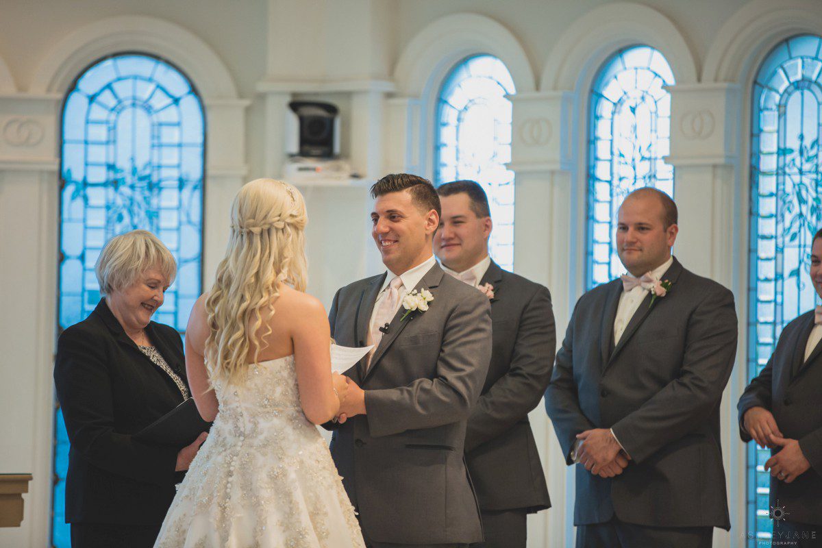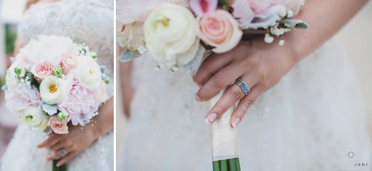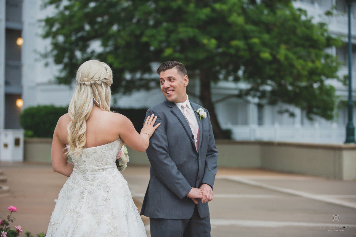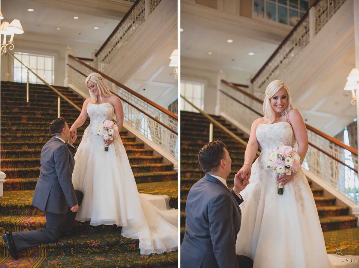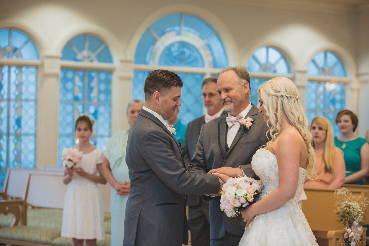 Elizabeth gets ready for her big day at Disney’s Grand Floridian Resort. She is wearing a Justin Alexander, ivory and silver A-line ball gown from The Bridal Collection. It has lots of crystals and beading in what she calls “beautiful chaos”. Her four attendants are in various styles of blush pink, chiffon gowns. Each carries beautiful bouquets of pink roses and baby’s-breath.