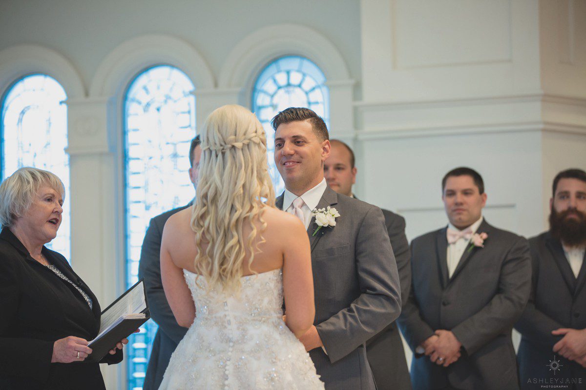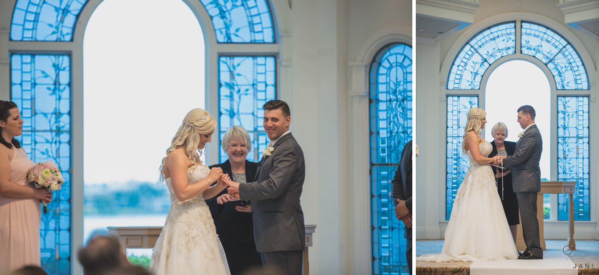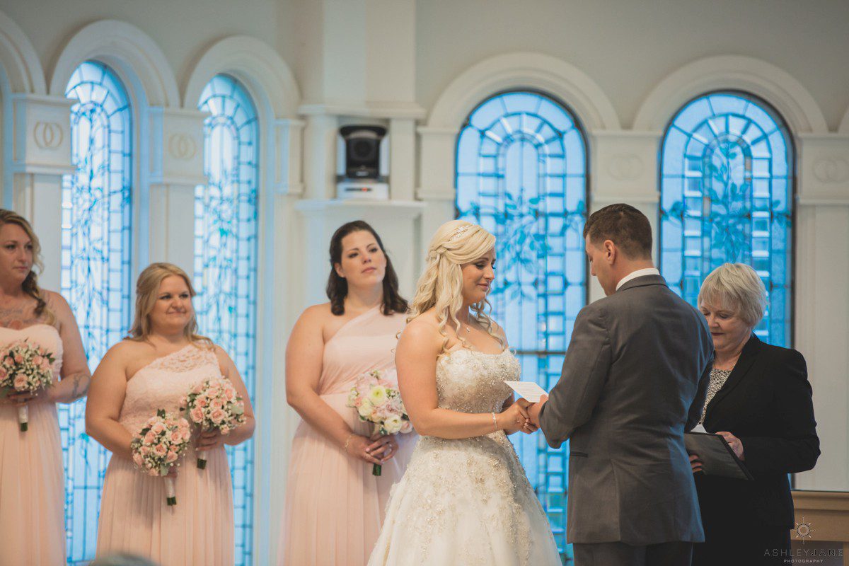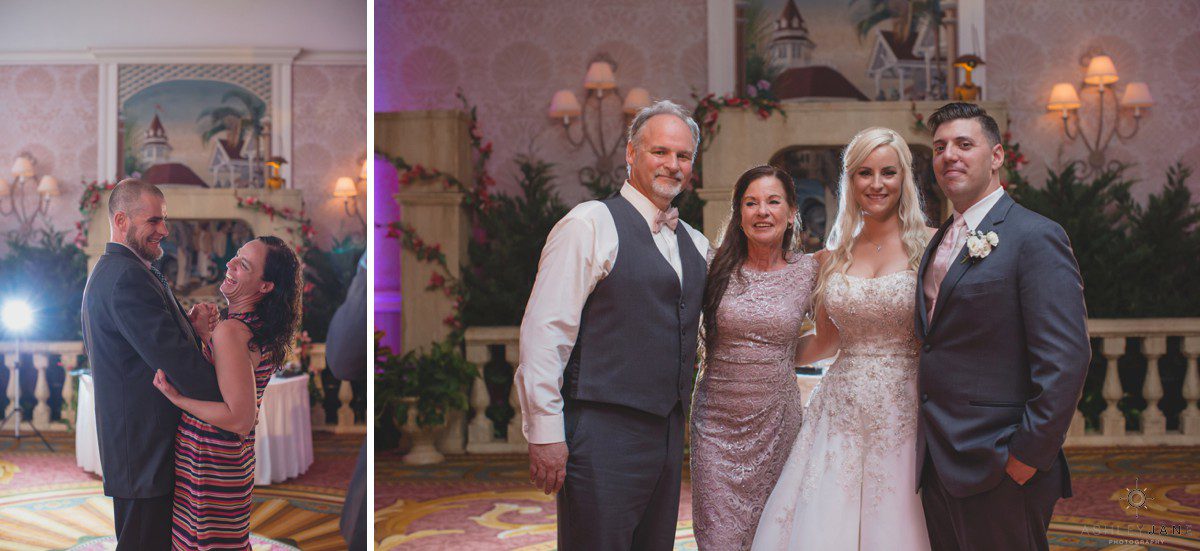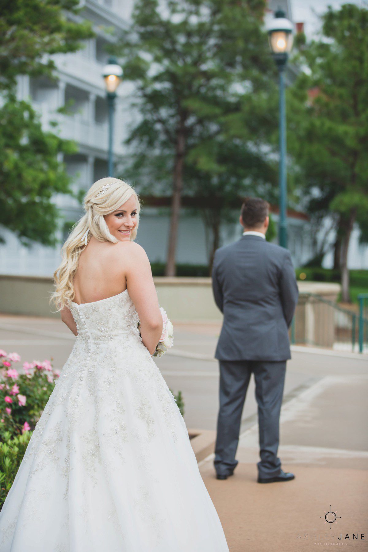Elizabeth gets ready for her big day at Disney’s Grand Floridian Resort. She is wearing a Justin Alexander, ivory and silver A-line ball gown from The Bridal Collection. It has lots of crystals and beading in what she calls “beautiful chaos”. Her four attendants are in various styles of blush pink, chiffon gowns. Each carries beautiful bouquets of pink roses and baby’s-breath.