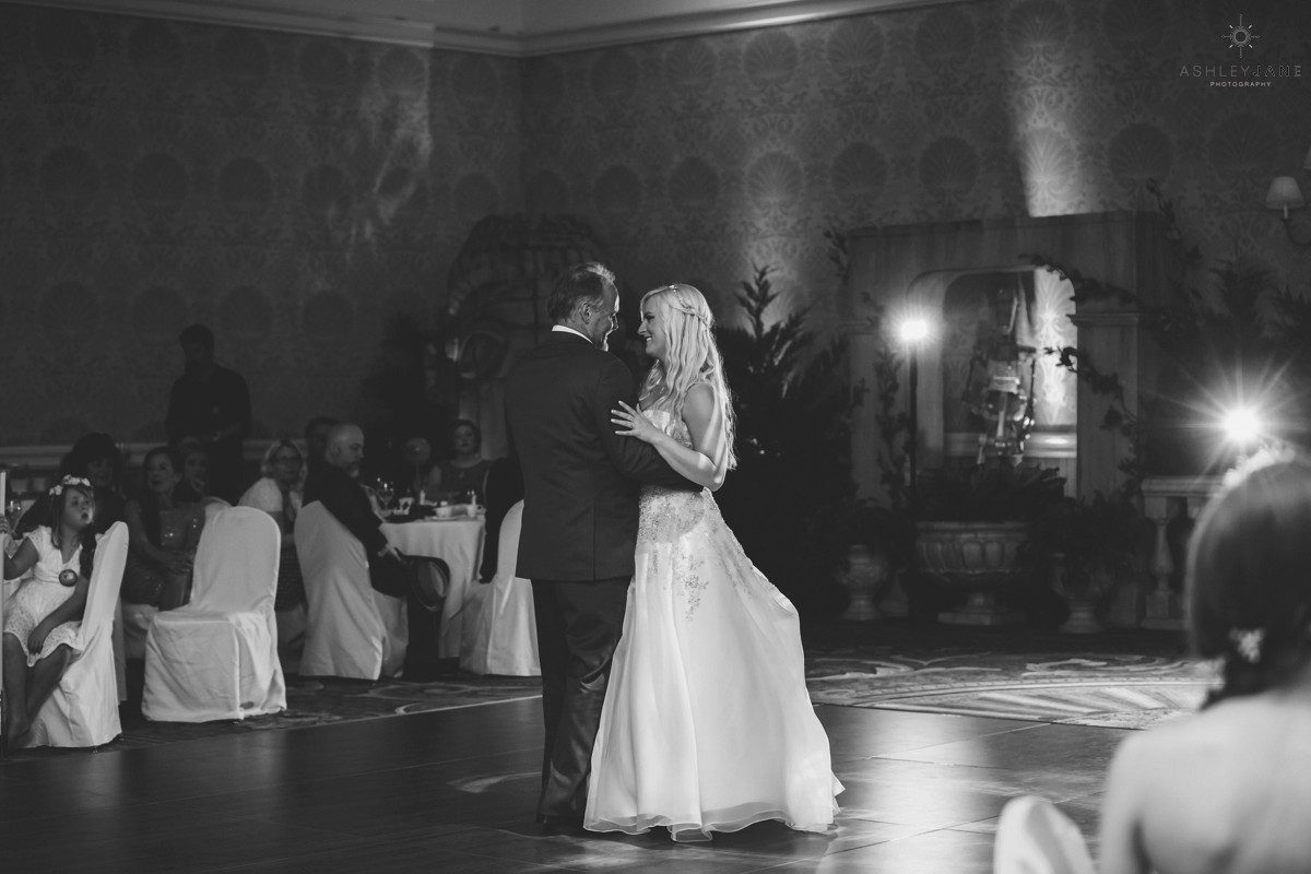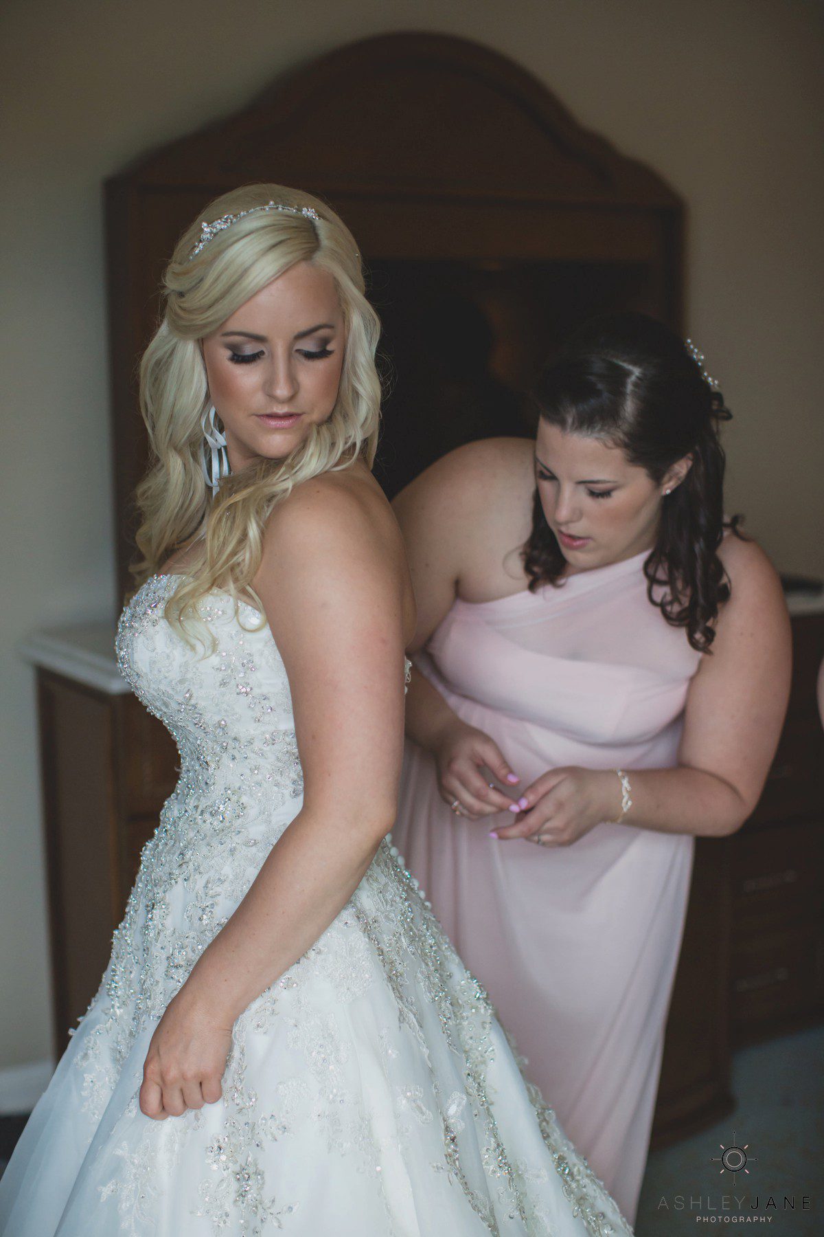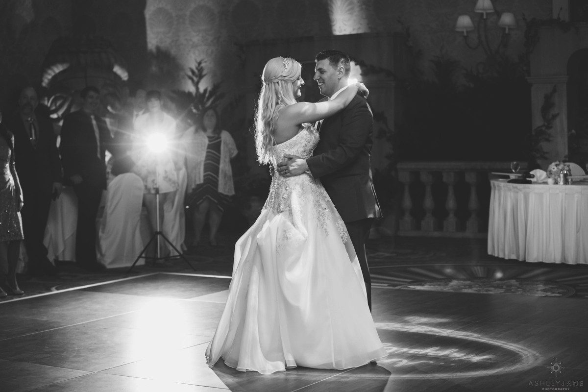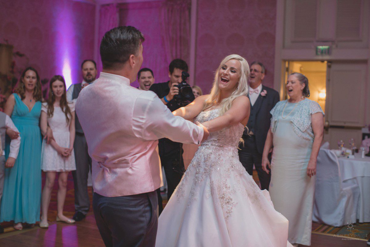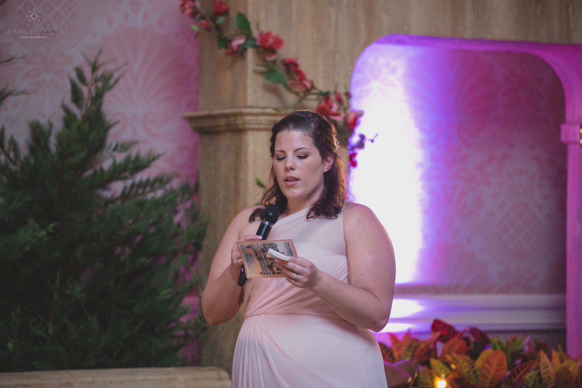 Elizabeth gets ready for her big day at Disney’s Grand Floridian Resort. She is wearing a Justin Alexander, ivory and silver A-line ball gown from The Bridal Collection. It has lots of crystals and beading in what she calls “beautiful chaos”. Her four attendants are in various styles of blush pink, chiffon gowns. Each carries beautiful bouquets of pink roses and baby’s-breath.