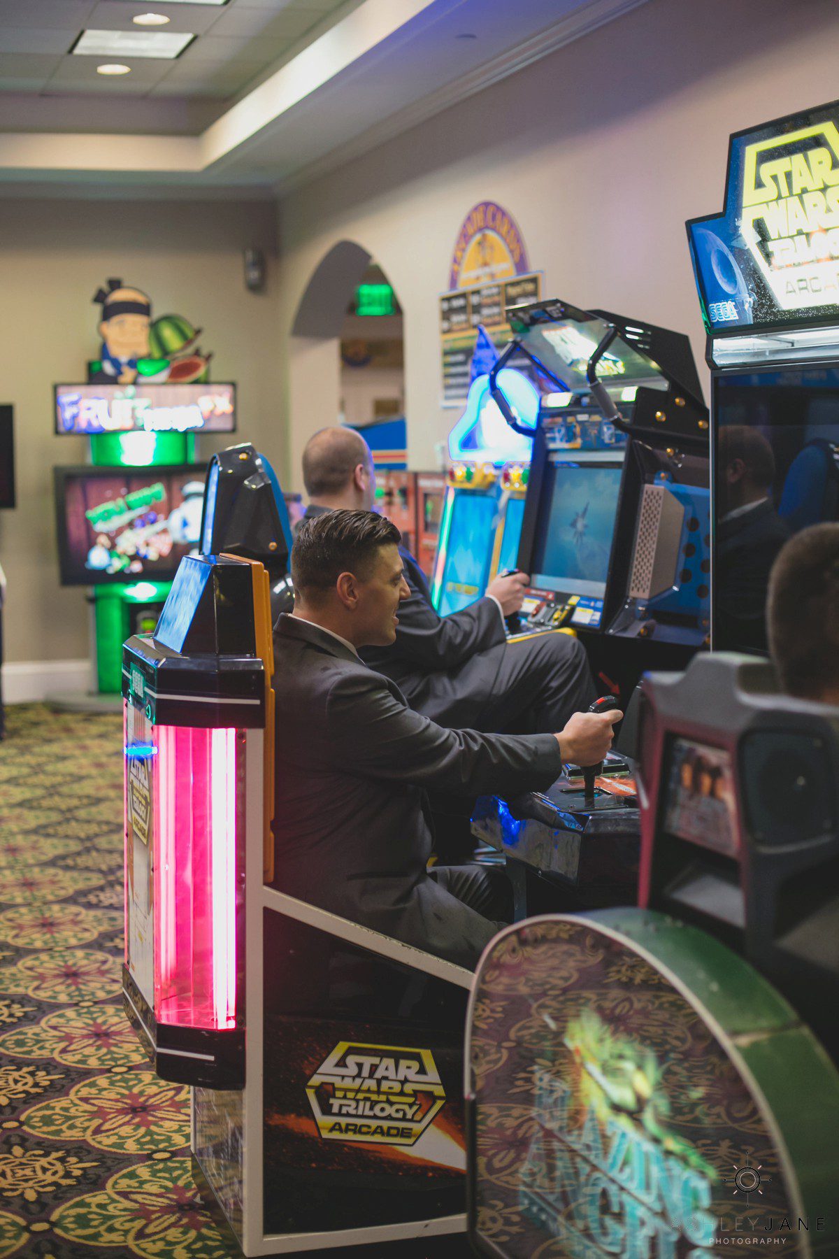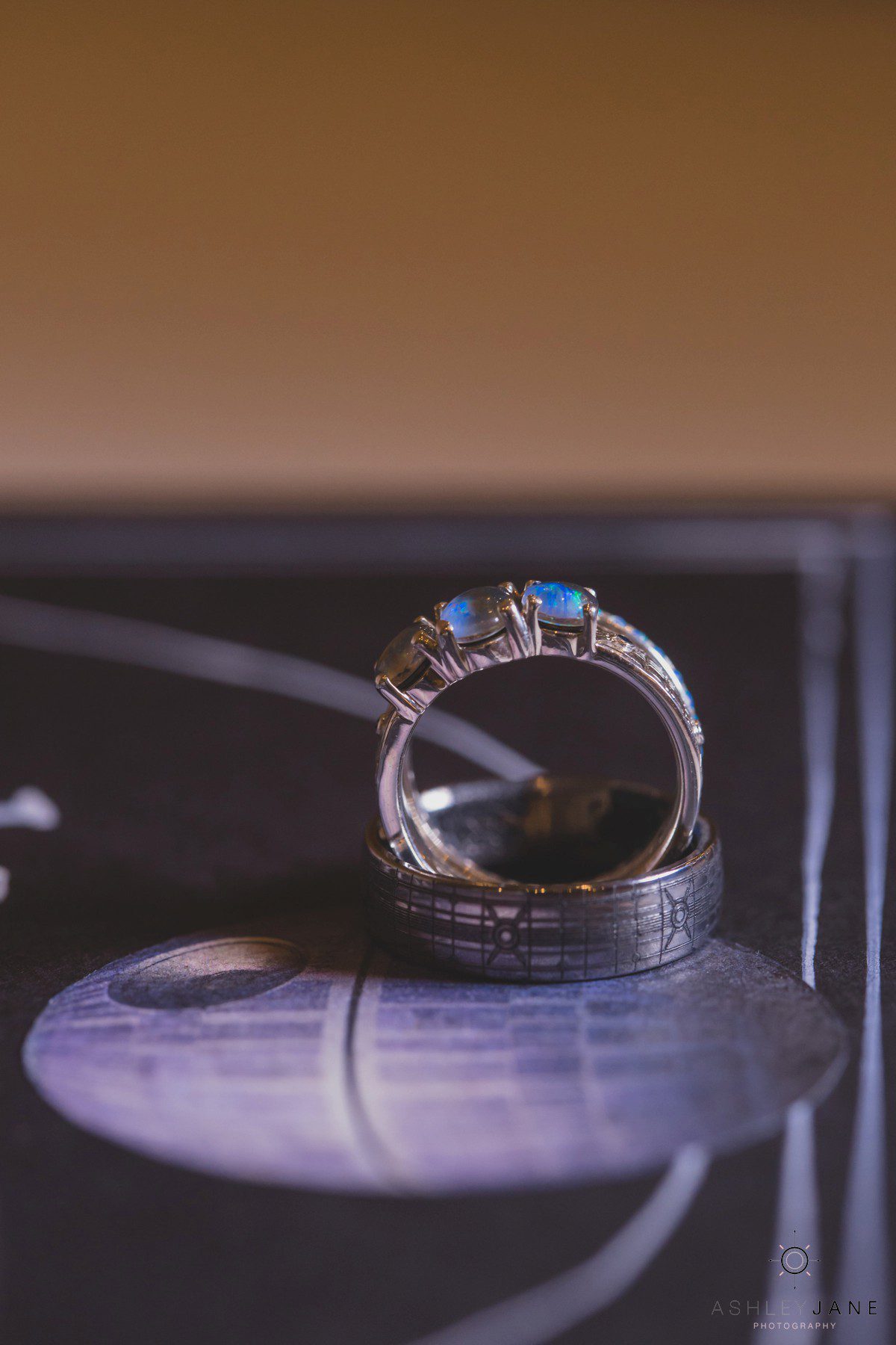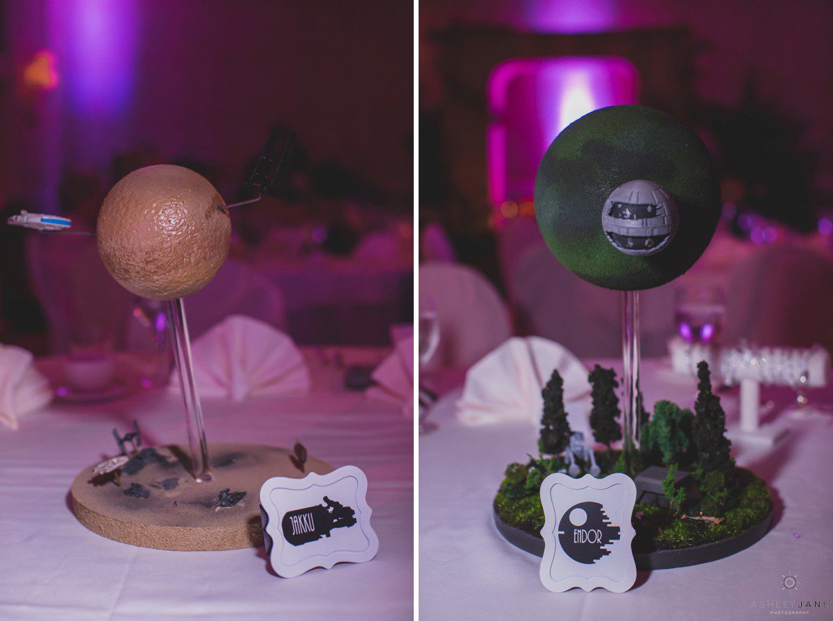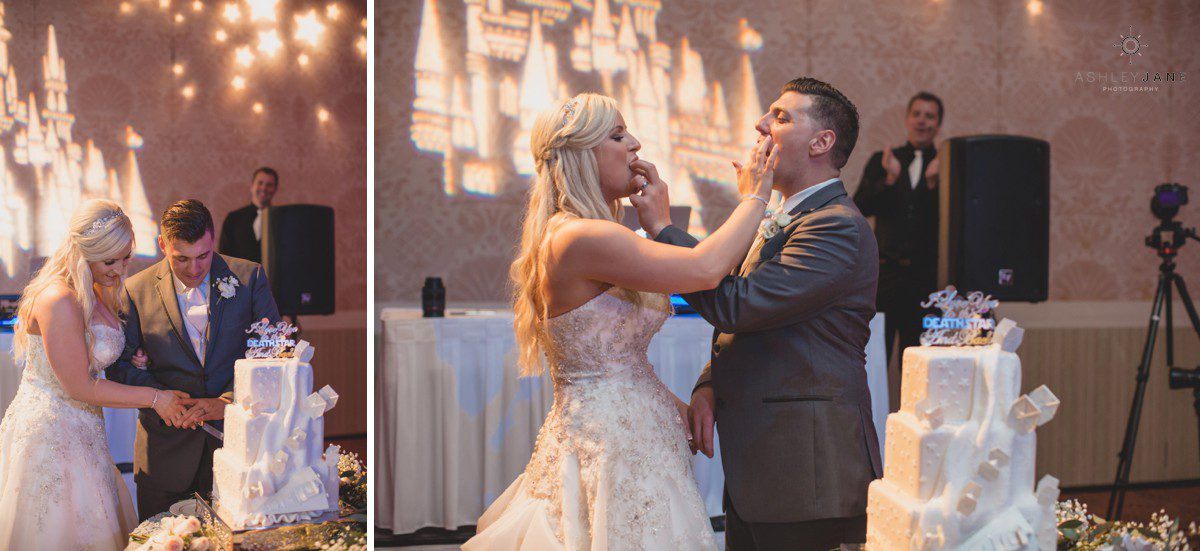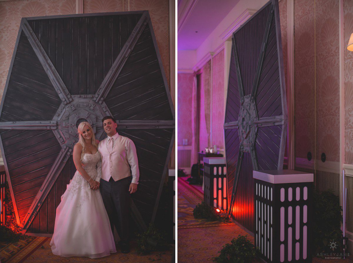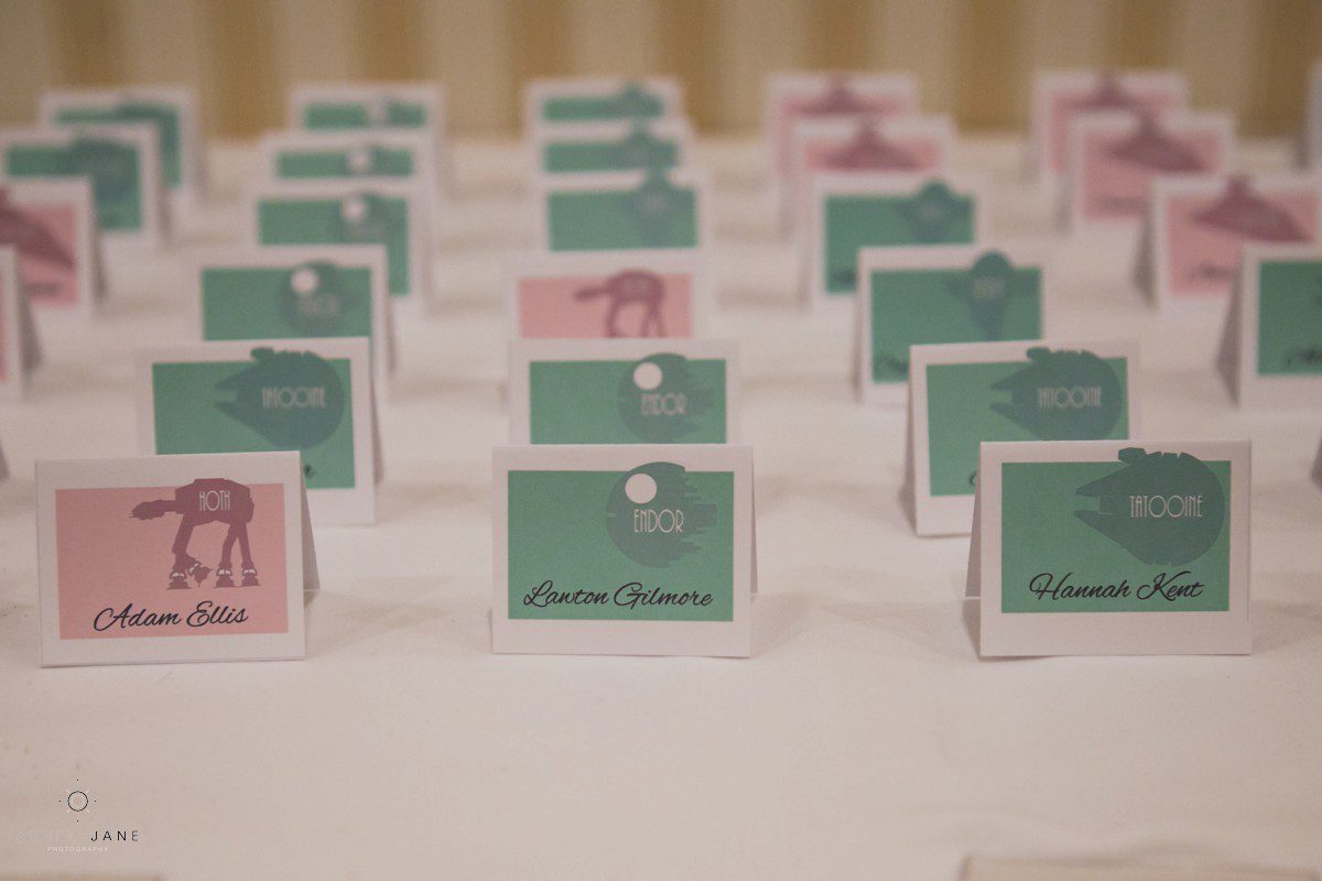 Their Star Wars themed reception was a thrill to photograph. Especially creative are the centerpieces designed by Elizabeth and Scott. Guests sit at tables named after a different Star Wars planet. Everyone was surprisingly delighted when R2D2 and two Storm Troopers came in for a visit. Their incredible cake, in a galaxy of its own, has an Imperial Star Destroyer on it surrounded by TIE Fighters. It’s topped with “I Love You to the DEATHSTAR and Beyond”.
