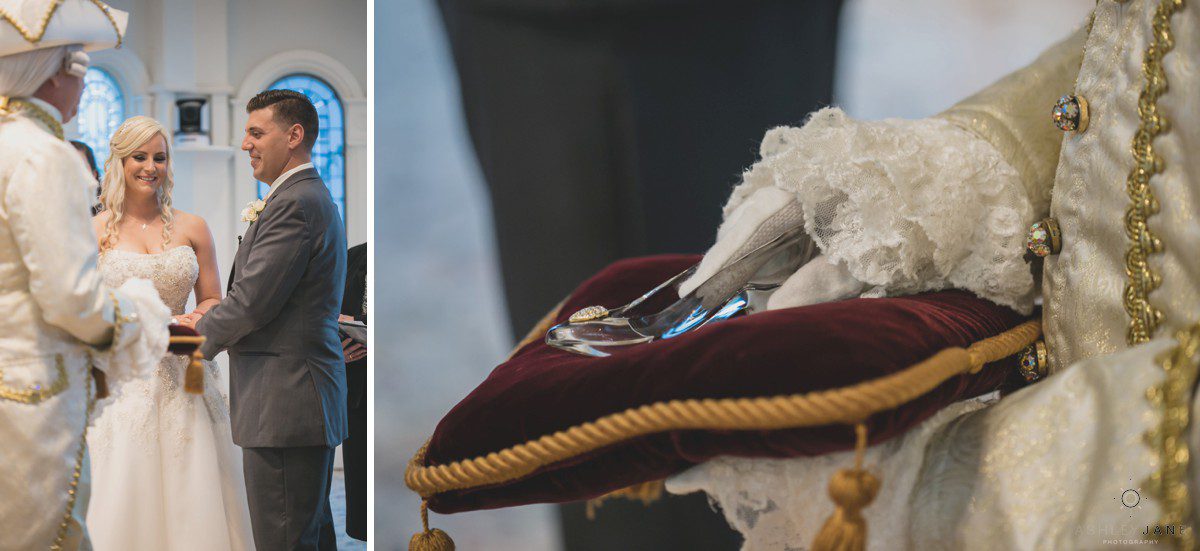 The ceremony, at Disney’s Wedding Pavilion, is situated on its own private island on Seven Seas Lagoon. It certainly has a romantic feel, evident in the Victorian spires, vaulted ceilings, and arched windows. While they are saying their vows, Cinderella’s Castle is in perfect view behind them. Since the best man “forgot” to bring the wedding rings, Disney’s Major Domo saves the day by bringing the rings to the alter on a silk pillow, nestled in a glass slipper. The marriage portraits are taken throughout the beautiful gardens and grounds of the Wedding Pavilion.