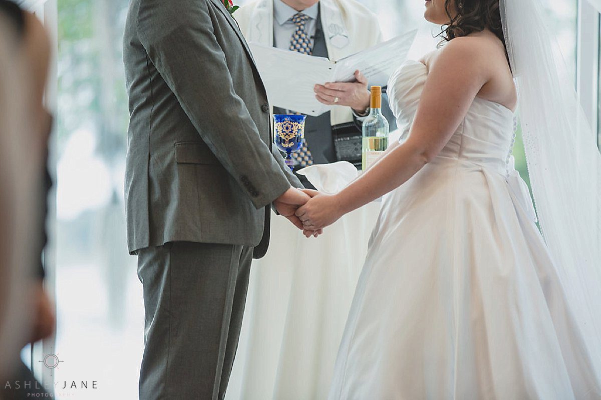 The ceremony was a traditional Jewish ceremony performed by a rabbi under a chuppah. They hired a harpist for the ceremony music. At the end, Michael smashes glass and everyone cheered mazel tov!